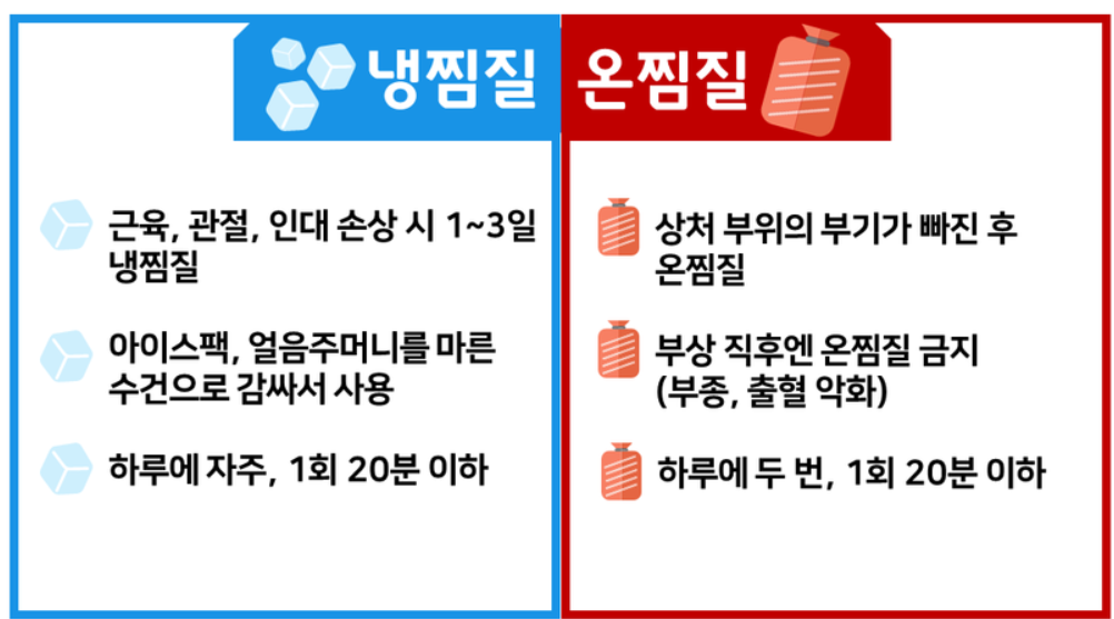 - 통증을 완화하고 염증을 줄이기 위해 영향을 받는 부위에 얼음찜질을 해주세요. 단 주의사항은 염좌나 염좌 후 1~3일 동안은 얼음 찜질을 하고, 3일 후에도 통증이 지속되면 온찜질을 해야 합니다.