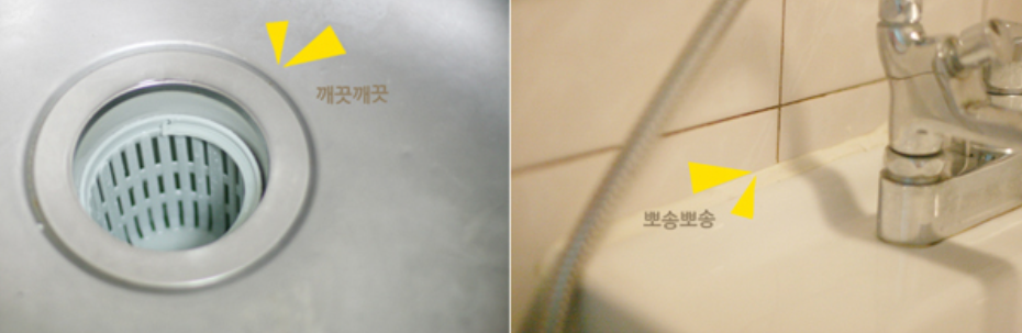 설거지를 하거나 양치질을 한 후에는 대개 싱크대에 물이 남아 있는 것을 볼 수 있습니다. 여름 동안 집안의 높은 습도를 방지하려면 집안에 수분이 머물거나 고이지 않게 해줘야 합니다. 만약 화장실 욕조나 싱크대에 물이 고여 있다면 집안의 습도가 올라가면 올라가지 내려가지 않습니다. 항상 싱크대나 욕조에는 물이 고이지 않고 잘 건조되게 유지해주세요.