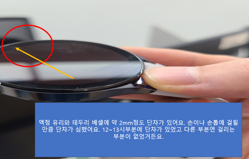 테두리 베셀과 액정유리와의 단차로 인한 손톱 걸림, 액정 테두리의 코팀 들뜸,