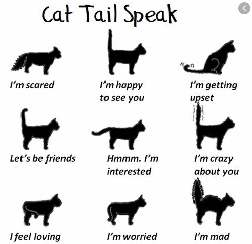 꼬리는 정서적 기압계로 , 잡는 방식과 위치, 털의 붓기 정도를 통해 감정을 정확하게 전달합니다. 신체 언어 및 기타 지표와 결합하면 두려움 과 공격성 에서 애정과 행복에 이르기까지 다양한 감정을 전달합니다 . 대부분의 사람들은 두려움과 공격성의 징후를 쉽게 인식하는 반면 꼬리가 고양이 애정의 지표라는 것을 인식하지 못합니다.