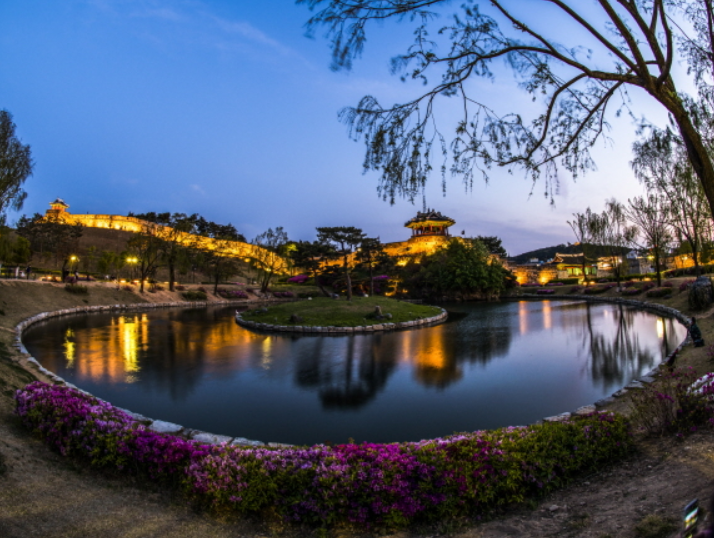 3) 저녁에 최고의 아름다움을 뽐내는 수원화성입니다. 이곳은 거중기, 활차, 녹로 등 다양한 신기술이 접목된 발명품과 동서양의 축성방법의 건축을 자랑하는 곳입니다. 수원화성은 4개의 성문이 전부 가지각색의 특색이 있어요. 유네스코 세계문화유산으로 지정된 아주 아름다운 곳입니다. 대한민국 으뜸 관광명소, CNN이 선정한 아름다운 50곳에 선정되었어요. 특히 야간에 조명의 아름다움과 호수에 비추는 달빛이 정말 장관입니다.