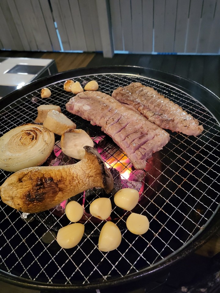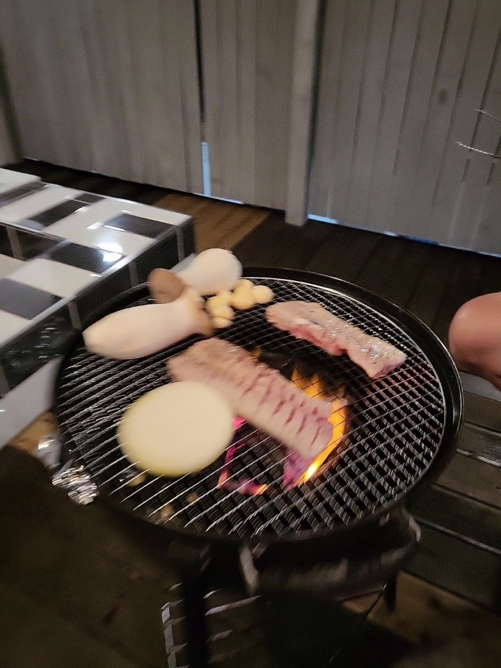 물에서 나오는 수증기가 숯에 발화가 일어나는 걸 막아주니 아주 고기도 맛있고 타지 않게 구워졌습니다.