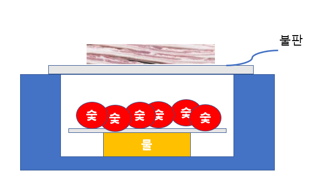 사실 삼겹살 전문점에서는 불쇼가 잘 안 날 거예요. 그 이유는 숯 아래 물 받침대가 있기 때문이에요. 말로는 좀 이해가 어렵죠? 그림으로 설명해드릴게요.