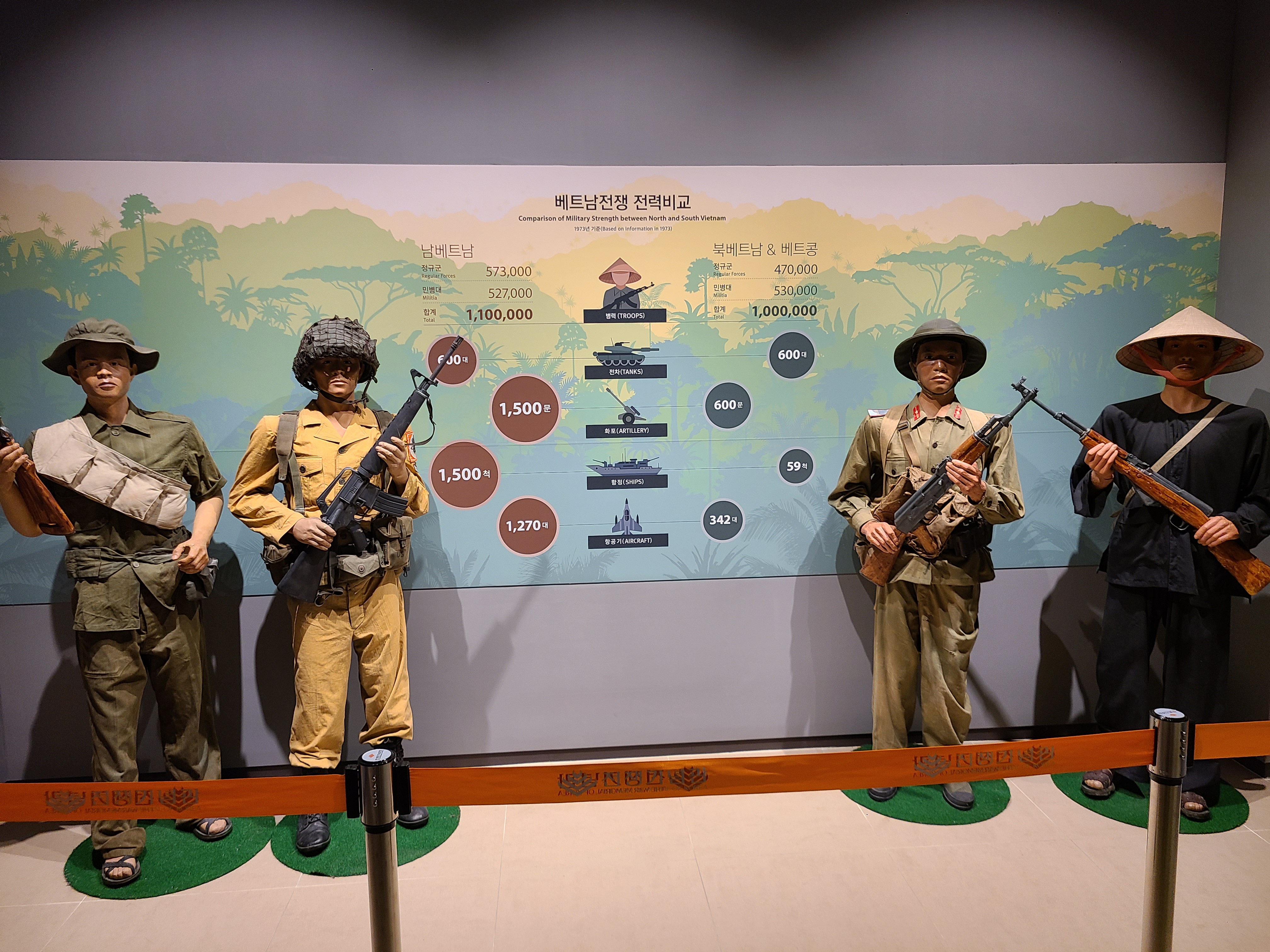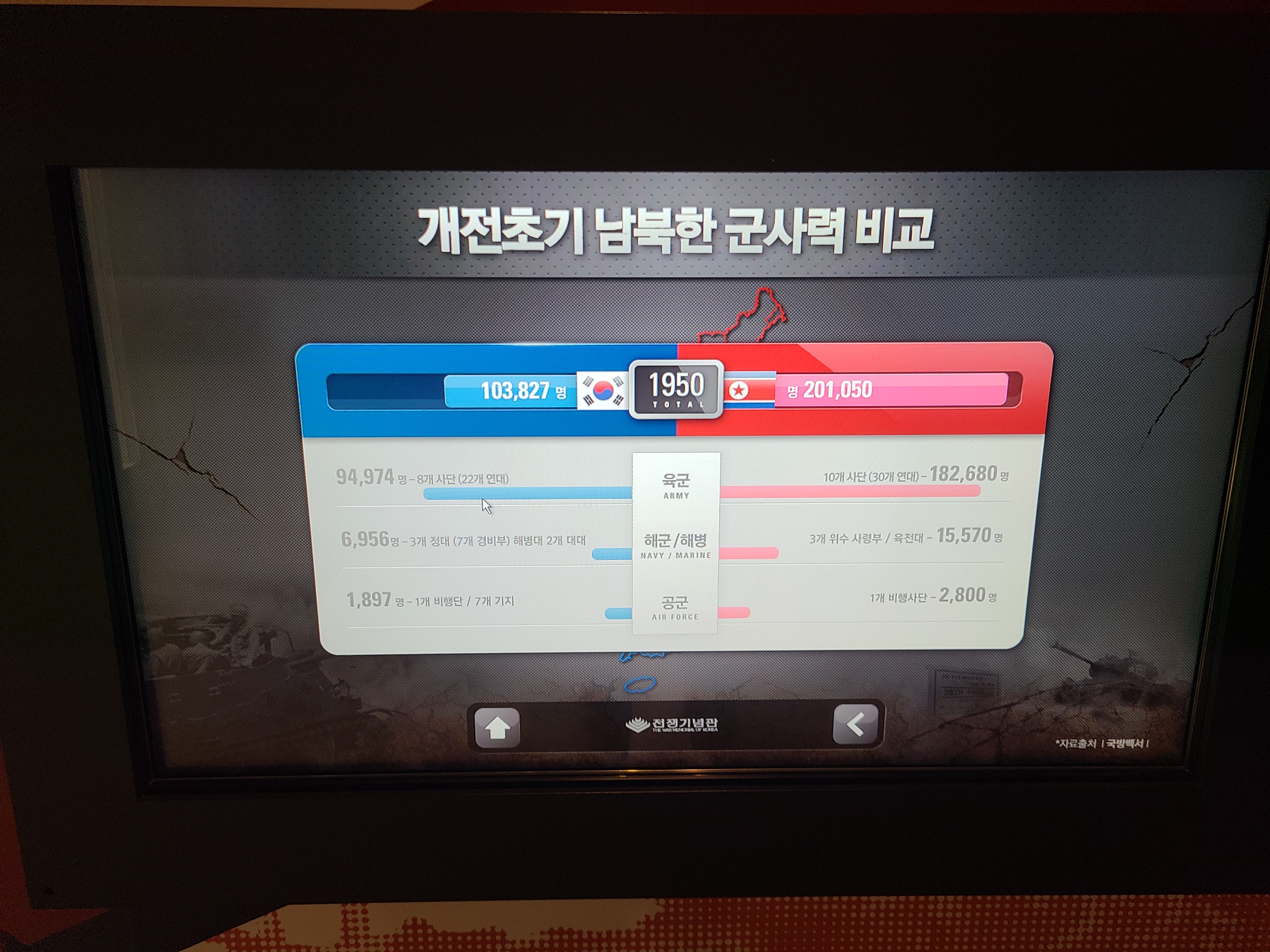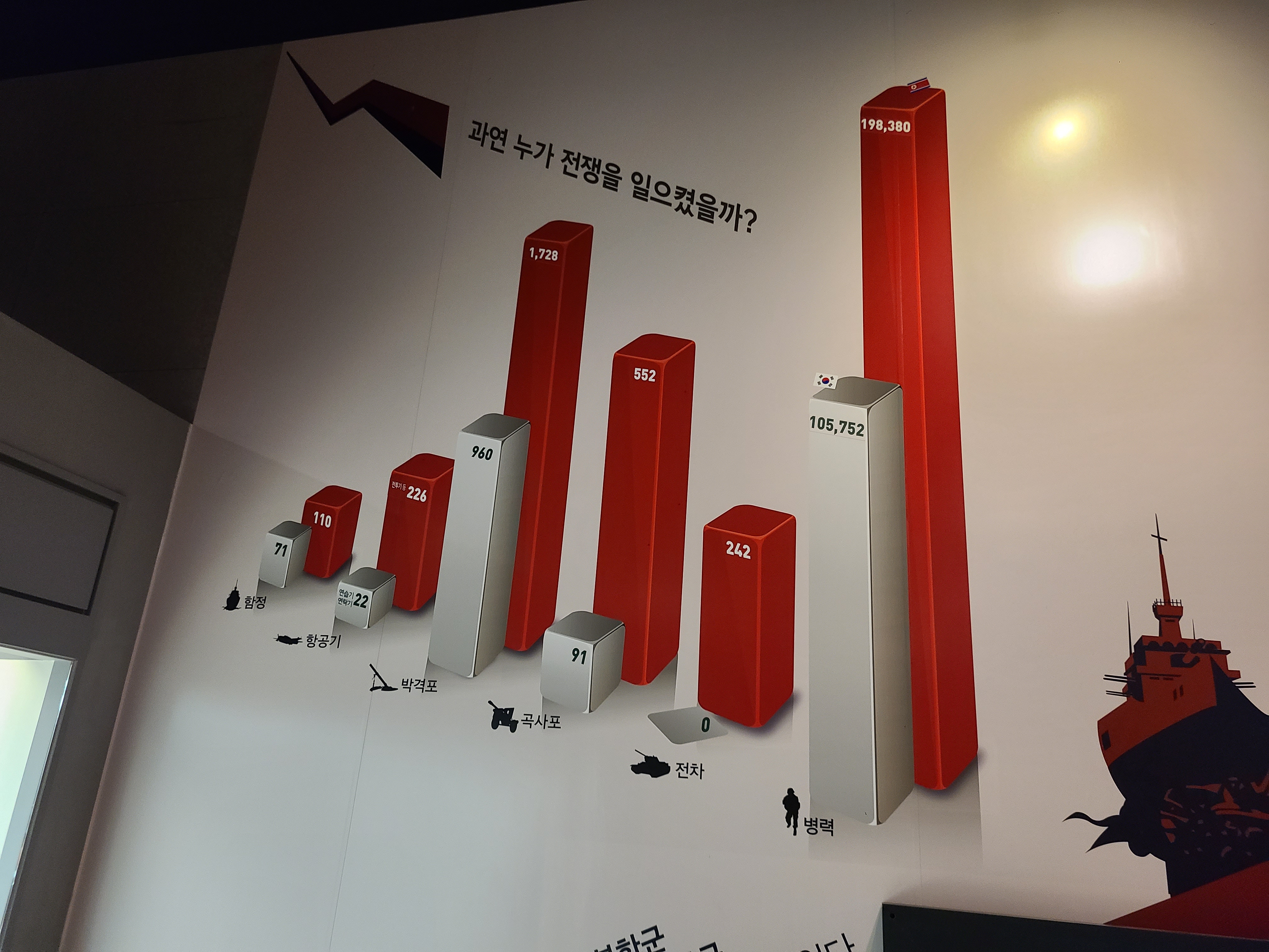 6.25 전쟁 당시에 남북한 군사력이 궁금한 적이 있었다. 하지만 용산 전쟁기념관을 방문하자 모든 의문증이 해소되었다. 너무나도 자세하고 보기 좋게 전시되었다. 6.25 전쟁 당시 육군은 절대적으로 열세였고 해군과 공군은 비교적 비슷하였으나 과거의 전쟁은 육군에 크게 좌지우지되었을 것을 고려하면 왜 전쟁 초기에 많이 밀려서 낙동강 전선까지 많은 희생을 치르게 되었는지 짐작케 되었다.
