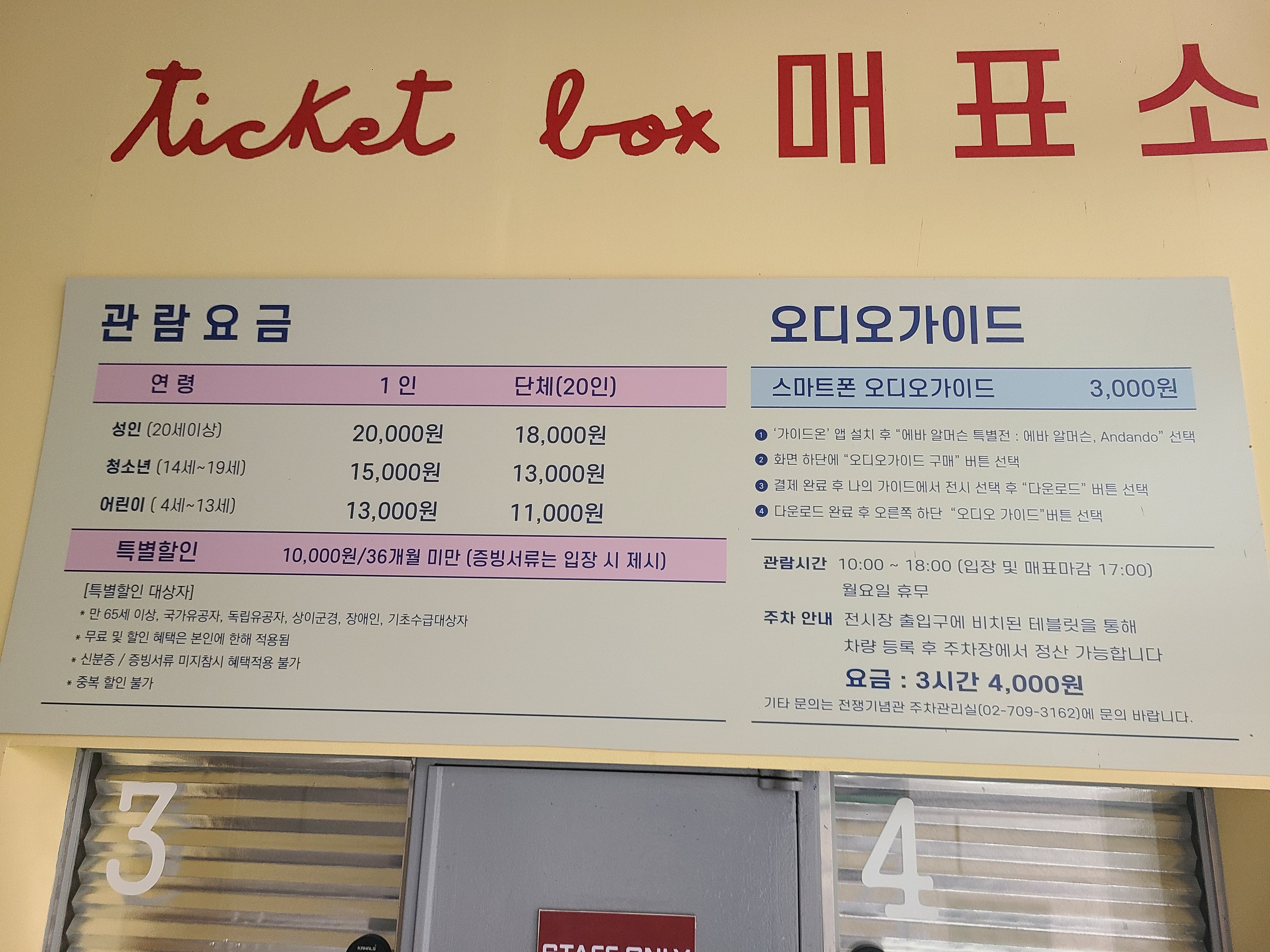 숙연한 마음을 가지고 나라를 위해 목숨을 바친 분들께 작은 묵념을 마치고 진짜 전쟁기념관 건물 입구로 발걸음을 향했다. 아뿔싸! 요금표를 보니 성인 1인에 20,000원이라고 적혀있었다. 하지만 돈은 받지 않았다. 인터넷에 검색해보니 무료라는 말도 있었고, 1인 20,000원이라는 말도 있었다. 용산 전쟁기념관 홈페이지를 들어가서 확실히 구분 지어보았다. 입장료는 무료임이 확실해졌다.