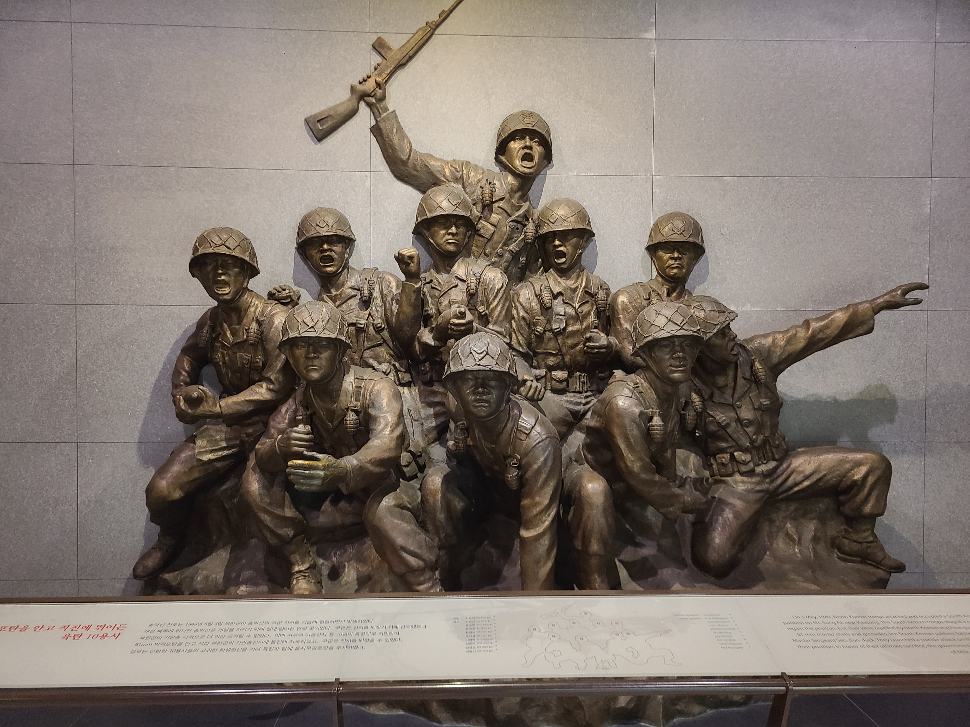 용산에 위치한 전쟁기념관 입구에는 커다란 조각상이 우뚝 서 있었다. 조각상 옆으로는 많은 군인들의 동상이 적진을 향해 돌격하는 불굴의 표정으로 모여 있었다. 과연 이 조각상들의 정체는 무엇일까 신기했다. 전쟁기념관의 입구에 이 동상들과 조각상의 의미는 무엇일까? 고민을 해봤다. 그리고 결론을 내렸다. 전쟁으로 희생된 많은 분들을 기리고 역사에 대한 인식과 전쟁의 참혹한 실상을 국민에게 알리기 위해 만들어진 전쟁기념관 입구에 6.25 전쟁 50주년을 기리기 위해 그에 맞는 상징적인 조각상들을 세워놓았던 것이다.