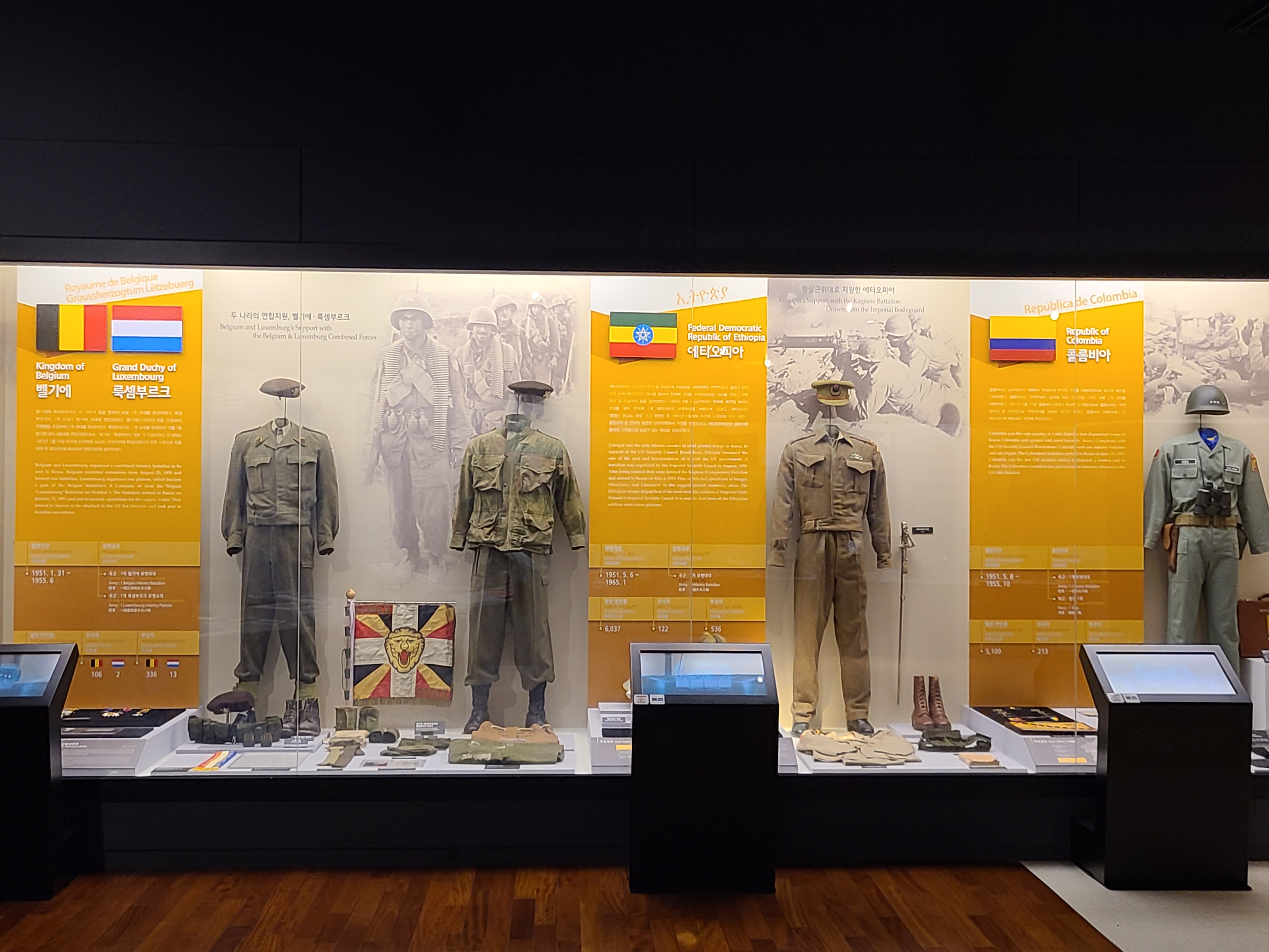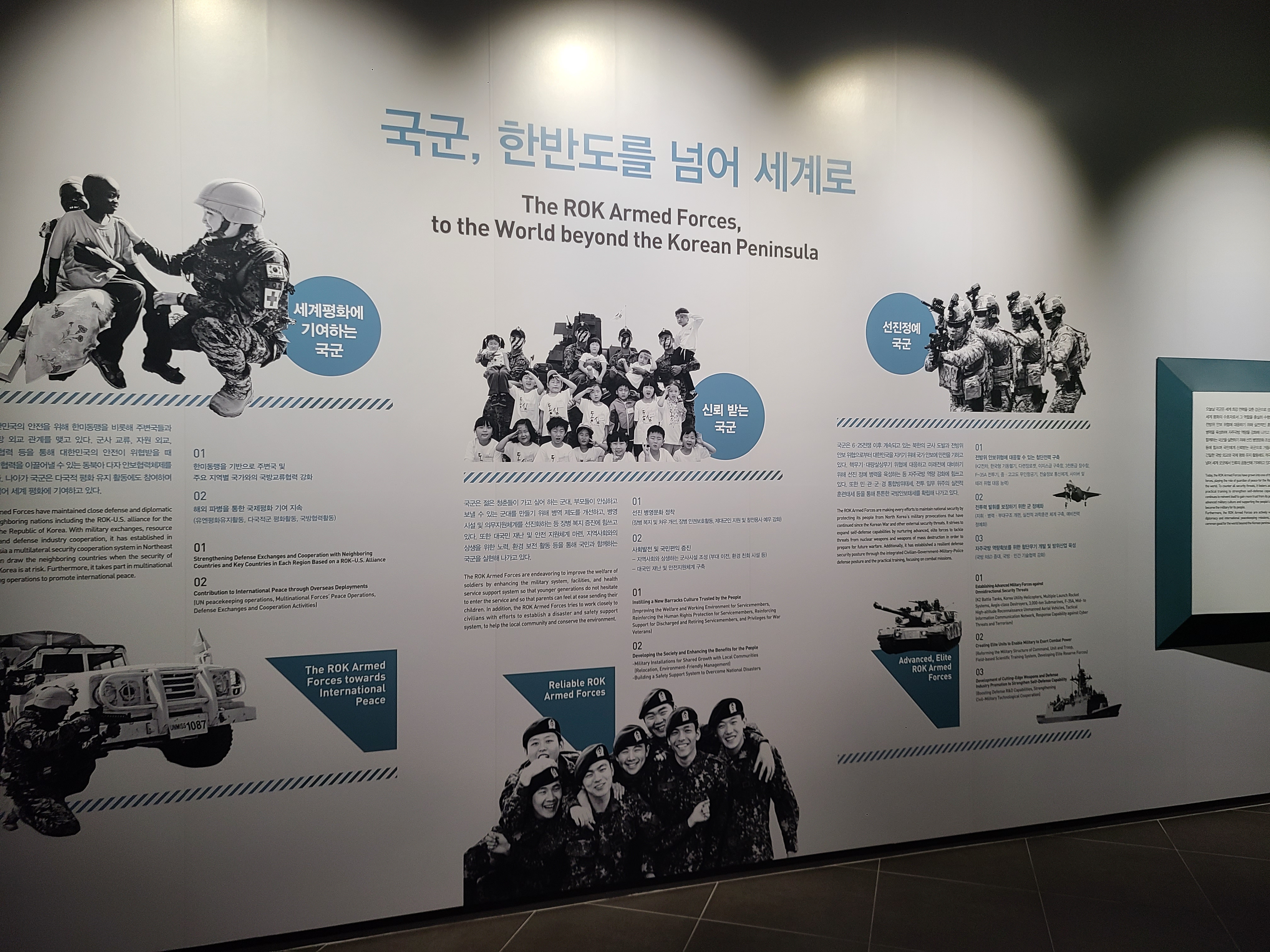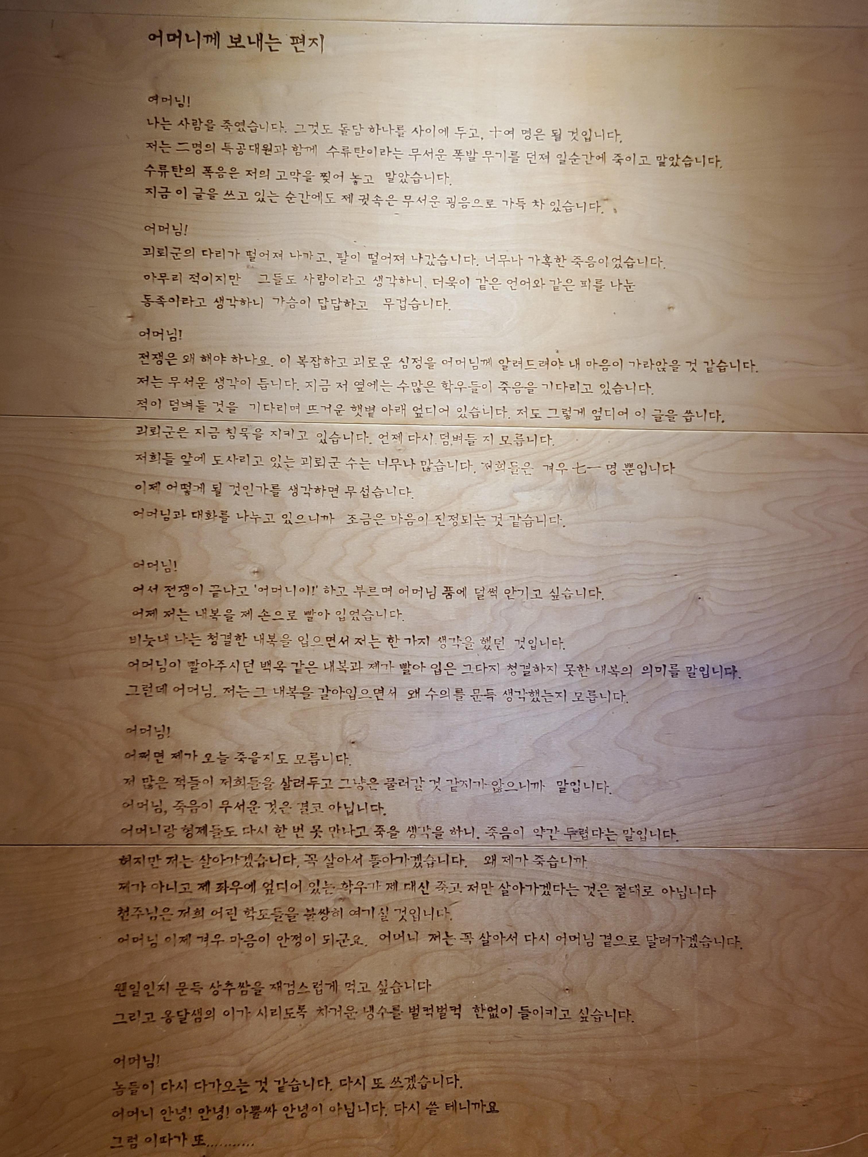 해외 파병실 전시회로 이동 중에 호국 추모실을 만나게 되었다. 조국의 평화를 위해 목숨을 바친 분들의 혼을 기리는 곳이었다. 그들의 희생과 헌신에 이 시대를 살아가는 국민의 한 사람으로서 경의를 표하게 되었다. 편히 잠드소서. 우리나라는 6.25 전쟁 때 유엔군의 연합과 동맹군의 도움을 받았다. 도움을 받기만 한 것이 아니라 다른 나라에게도 도움이 되는 파병을 여러 차례 하였다. 베트남 전쟁이 큰 예이다. 남 베트남과 북 베트남이 전쟁에도 한국군이 파병하여 큰 성과를 이루었다. 왜 지구촌엔 전쟁이 발발하여야만 하는 것일까. 아쉬움과 슬픔이 공존한다.