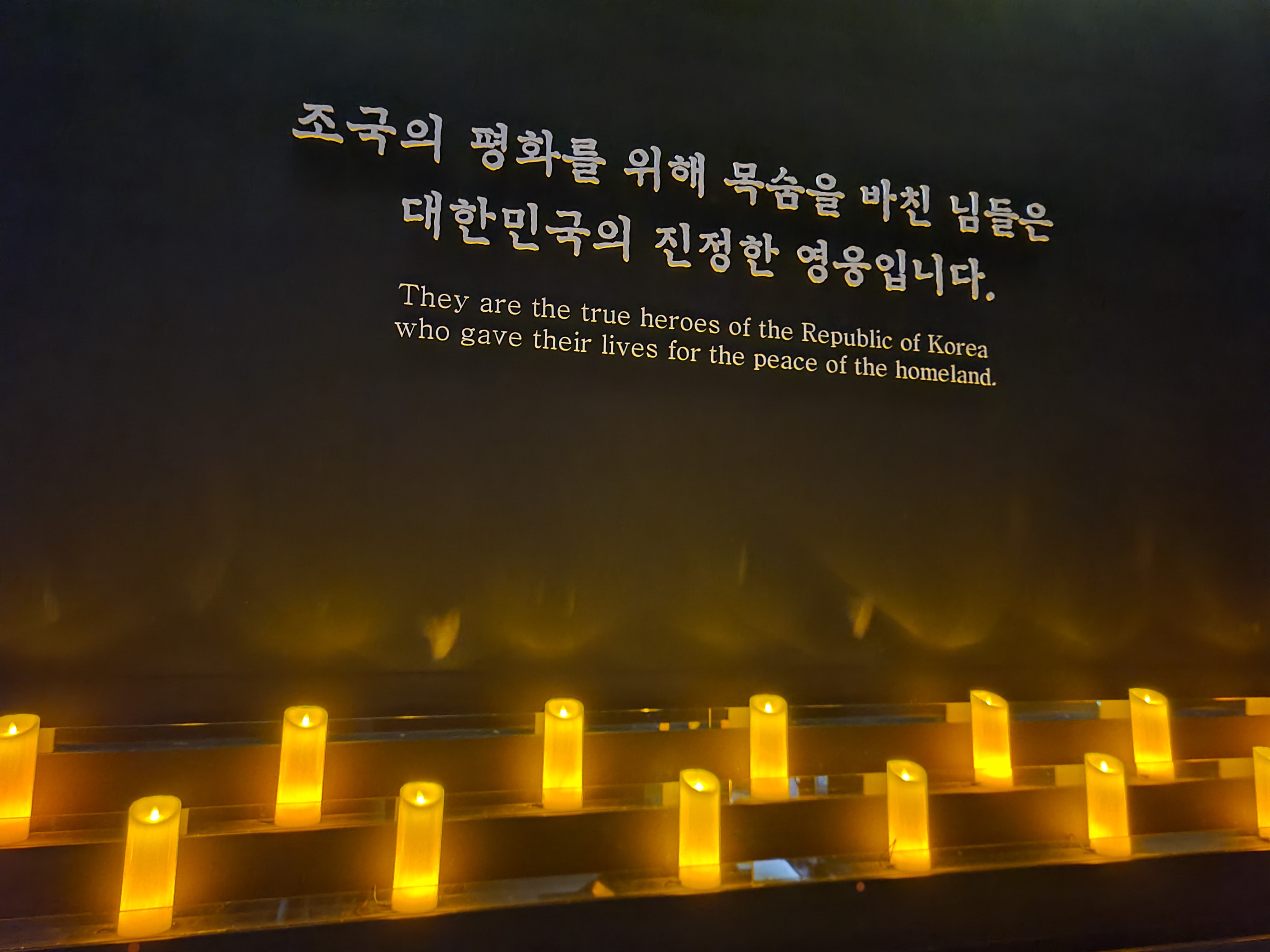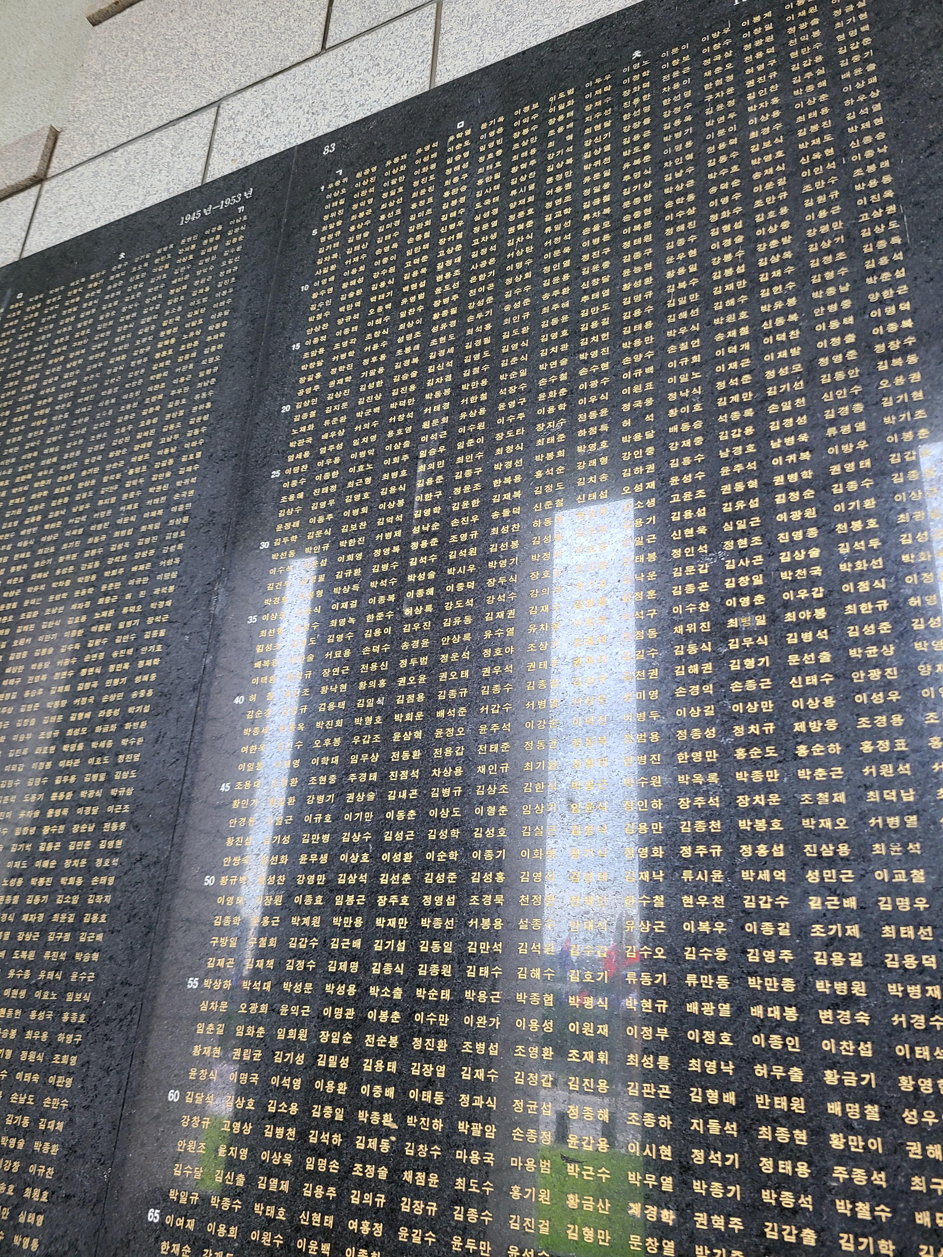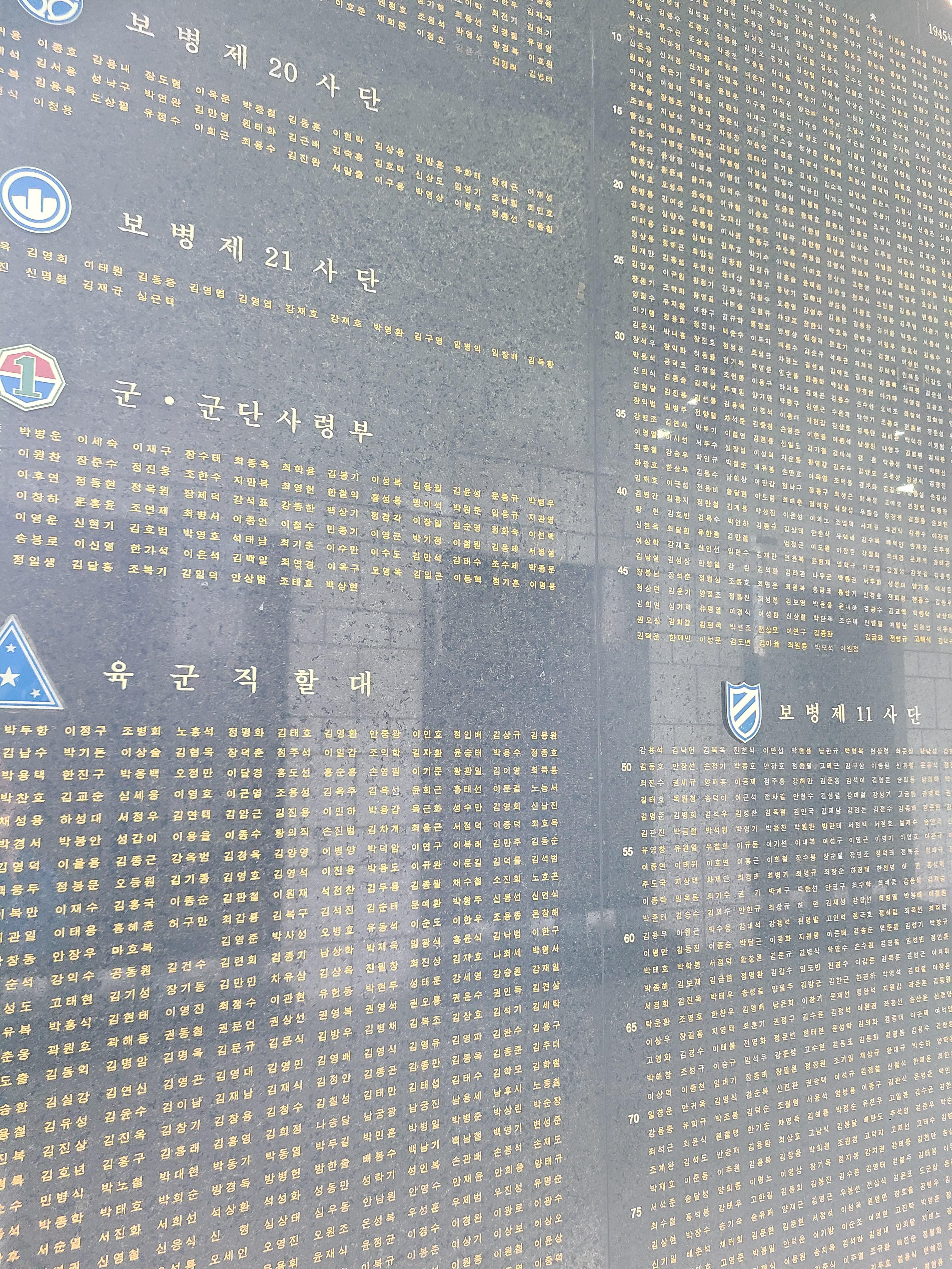 야외전시장에서 멋진 무기들과 비행기, 탱크들을 관람하고 전쟁기념관 건물로 본격적으로 발걸음을 돌렸다. 얼마나 멋지고 좋은 이야기들이 전시되어 있을까 내심 설레기도 했던 찰나, 내 마음을 숙연하게 하는 공간이 나왔다. 그곳은 한국전쟁에서 목숨을 잃은 국인들의 이름이 비석에 새겨져 있었다. 아주 다양한 군부대, 그리고 많은 이들이 잠들어 있었다. 한 글자 한 글자 다 읽어보지는 못했다. 계급과 육, 해, 공을 떠나 많은 이들이 나라를 지키기 위해 목숨을 바쳤던 그 과거들을 생각하니 너무나도 감사하고 숙연해지는 기분이 들었다.