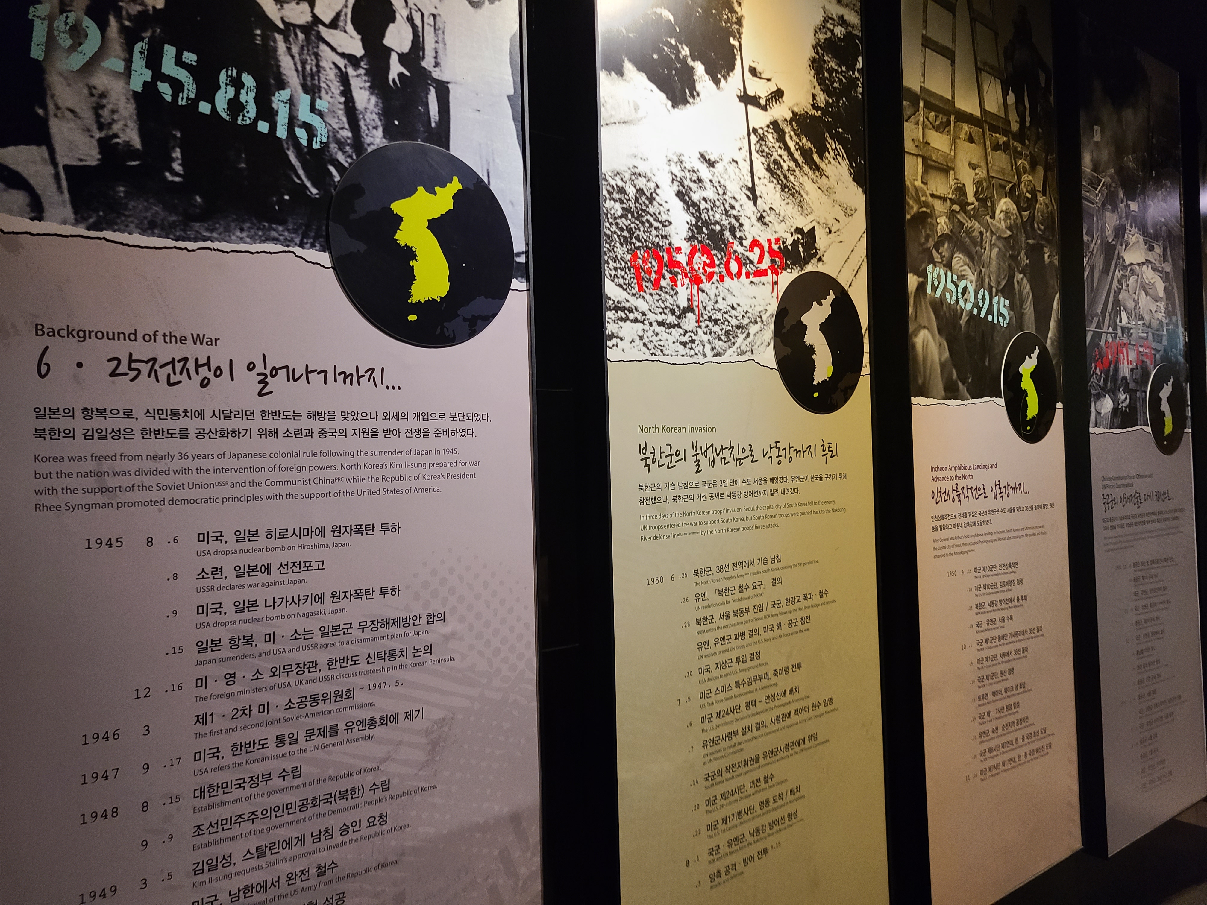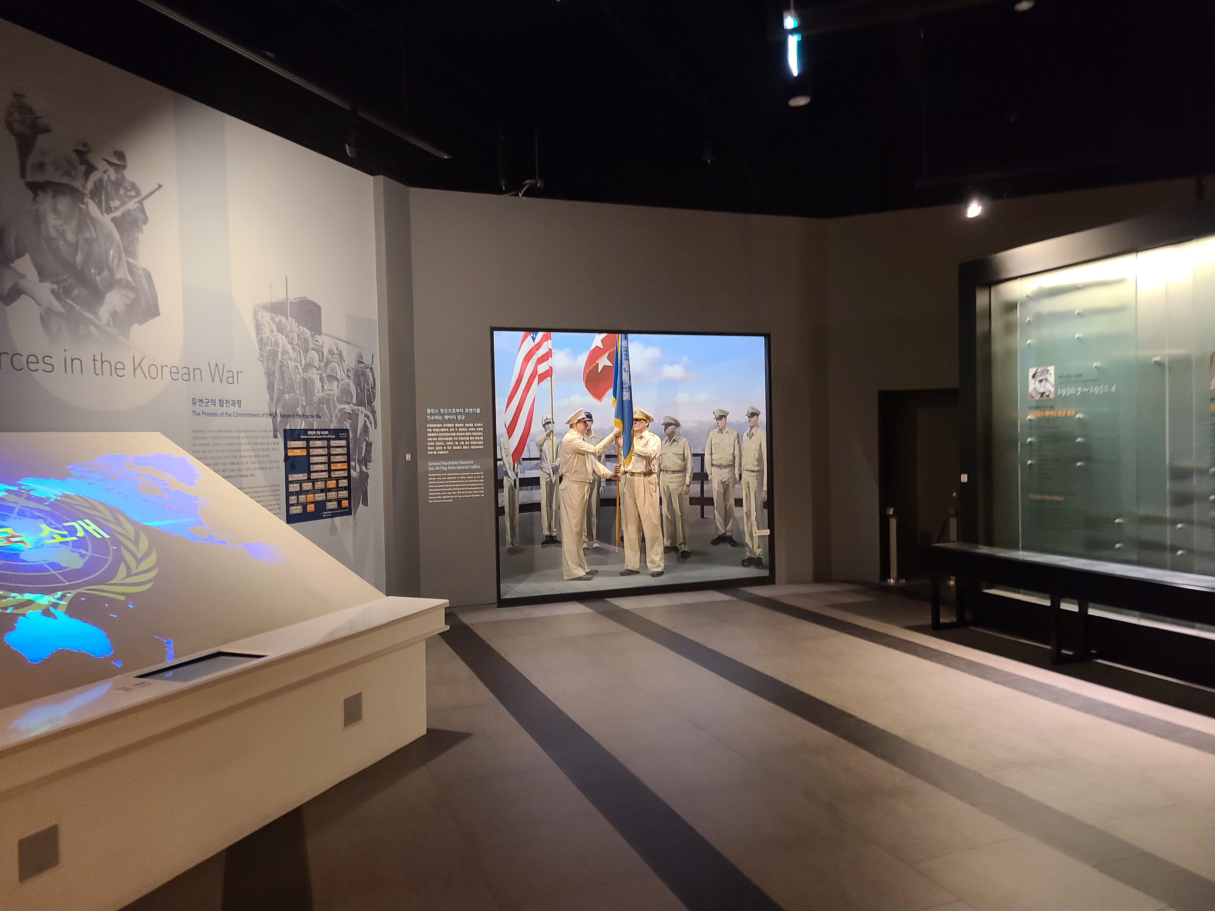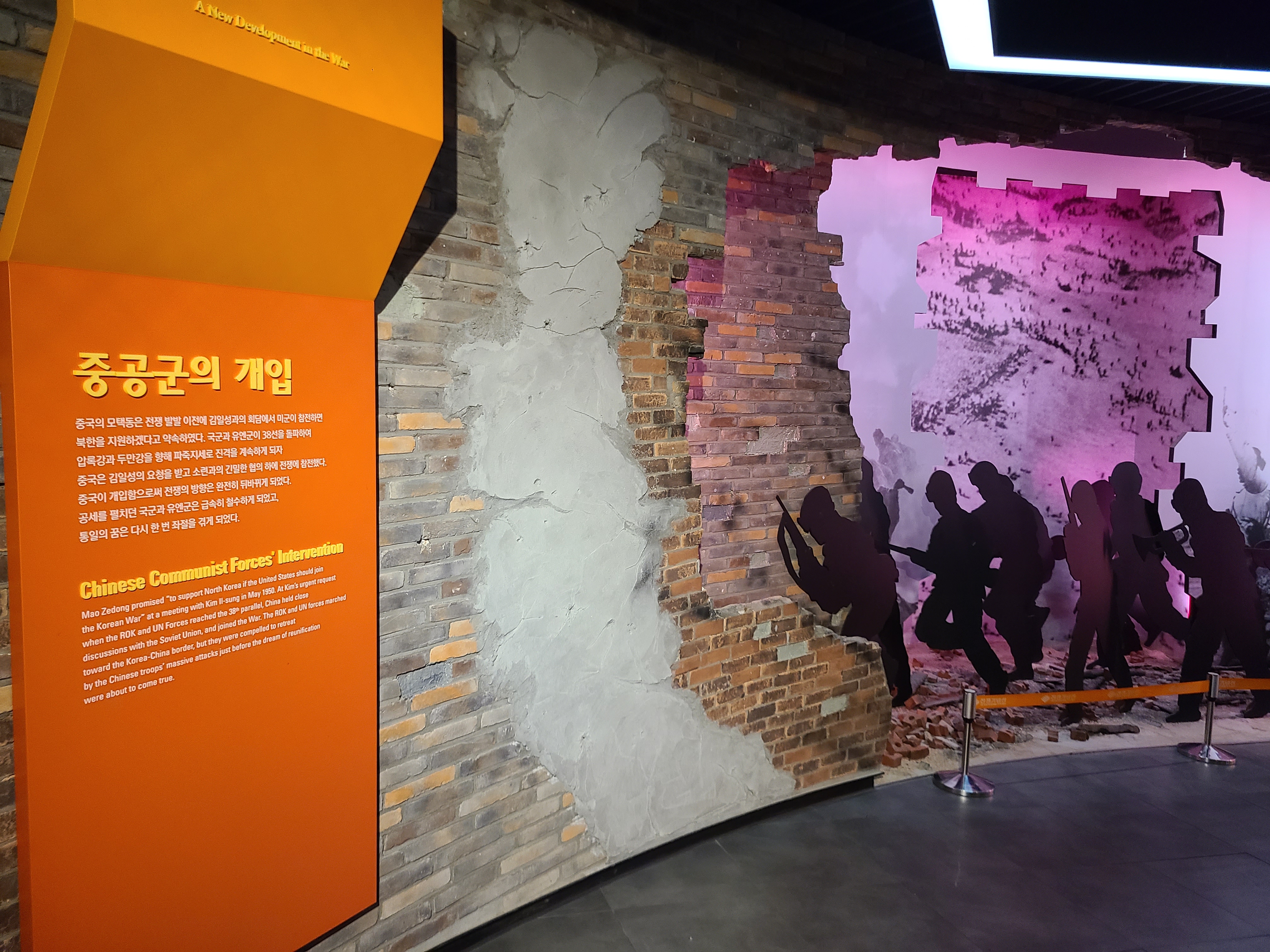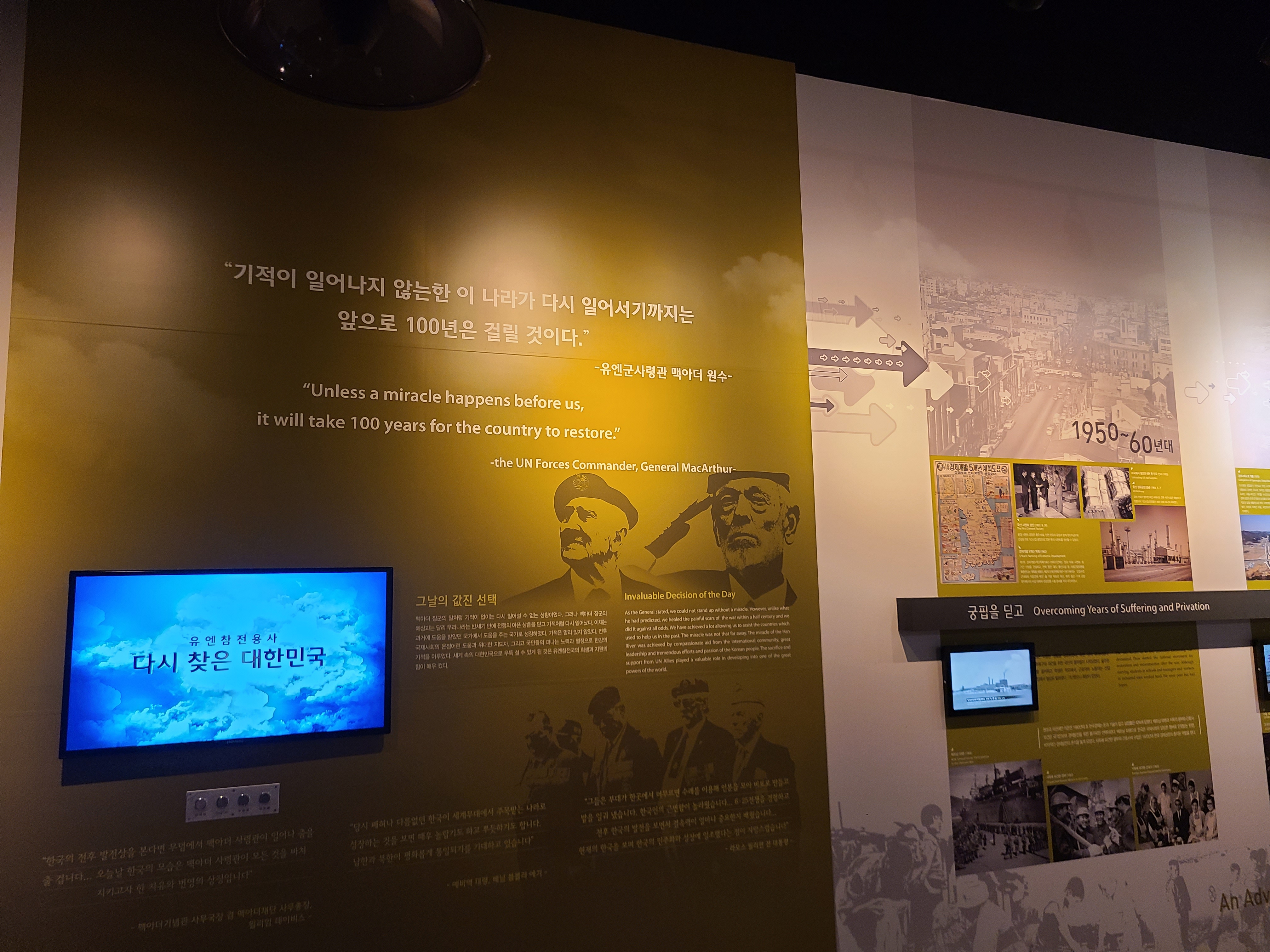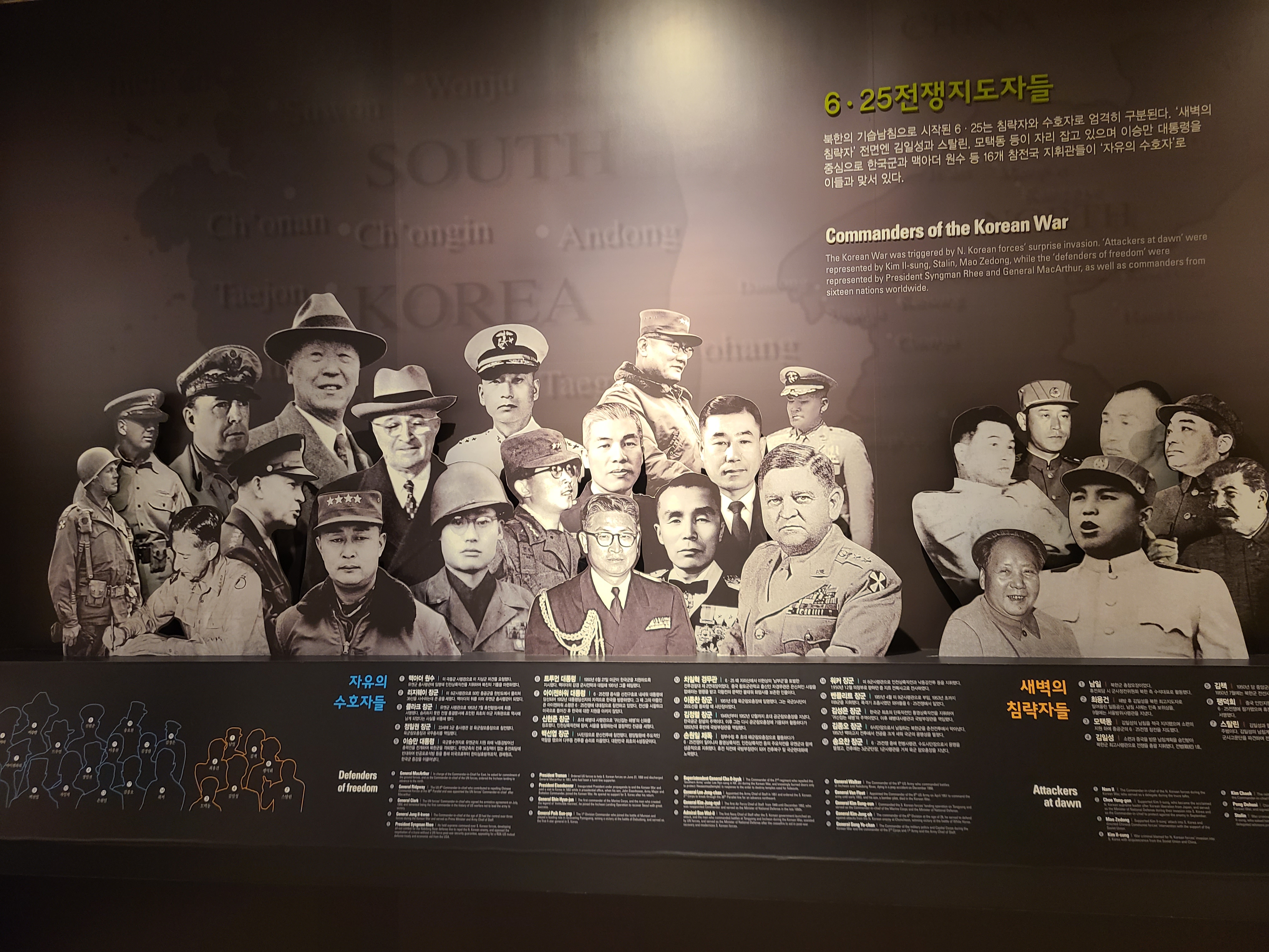 6.25 전쟁의 지도자들의 사진이 전시되었다. 왼쪽 부분에 6.25 전쟁의 양상을 바꾸었던 맥아더 장군의 사진도 있다. 많은 사람들이 희생을 치른 6.25 전쟁. 부산까지 밀렸던 남한은 다시 서울을 되찾게 된다. 그리고 서울 시청 앞에 대한민국의 국기를 다시 게양하는 쾌거를 이루게 된다. 그리고 인천 상륙작전으로 전세를 뒤집은 한국과 동맹군들은 그 기세로 중국 국경 가까이까지 치고 올라가게 된다. 북한이 남한을 침공하기 전 중국과 러시아에게 동맹을 요청한 북한. 남한이 승리의 기세로 밀고 올라오기에 중국은 북한의 동맹국으로써 군을 파견한다. 그 이름 유명한, 인해전술의 시작이었다.