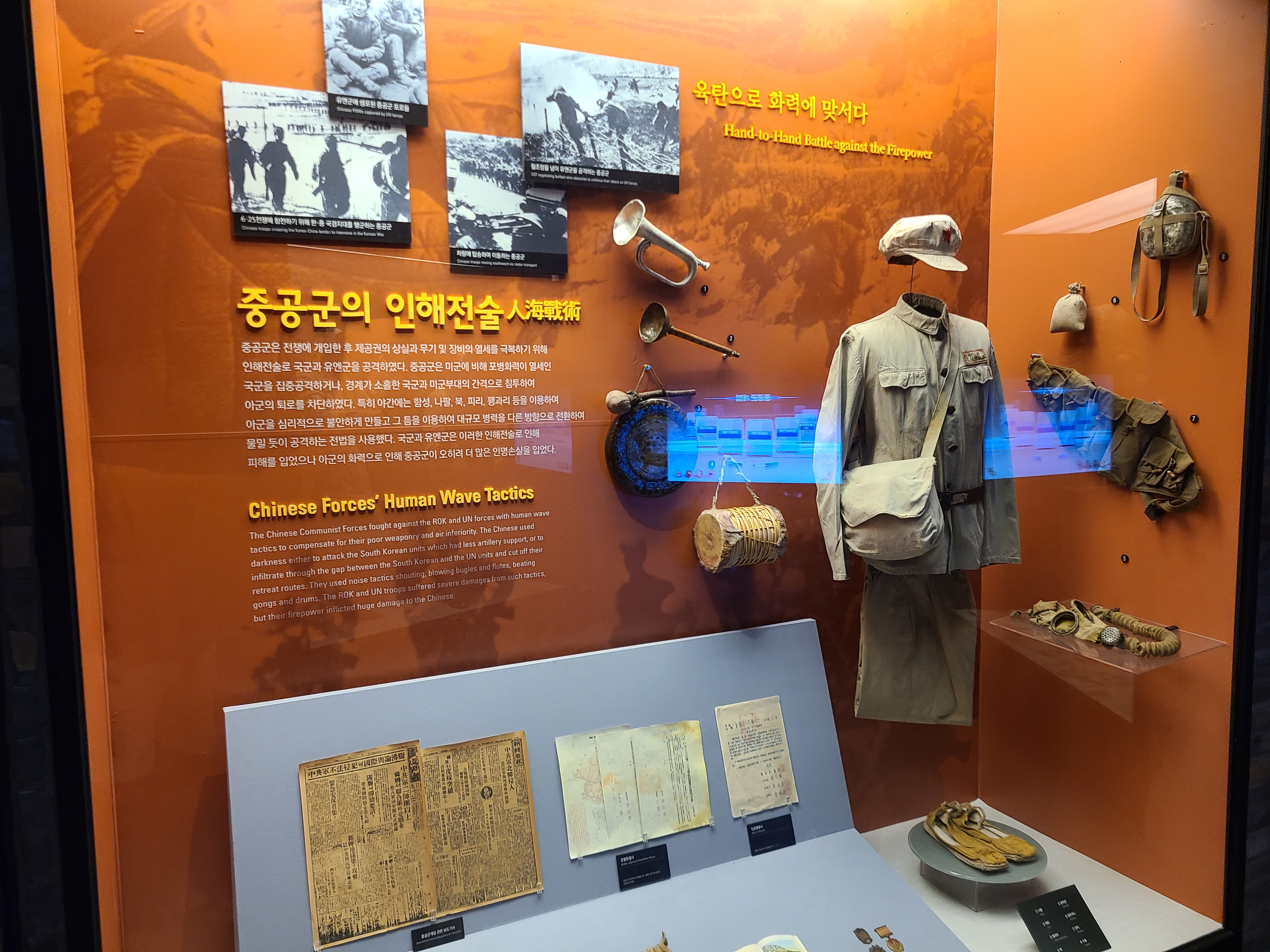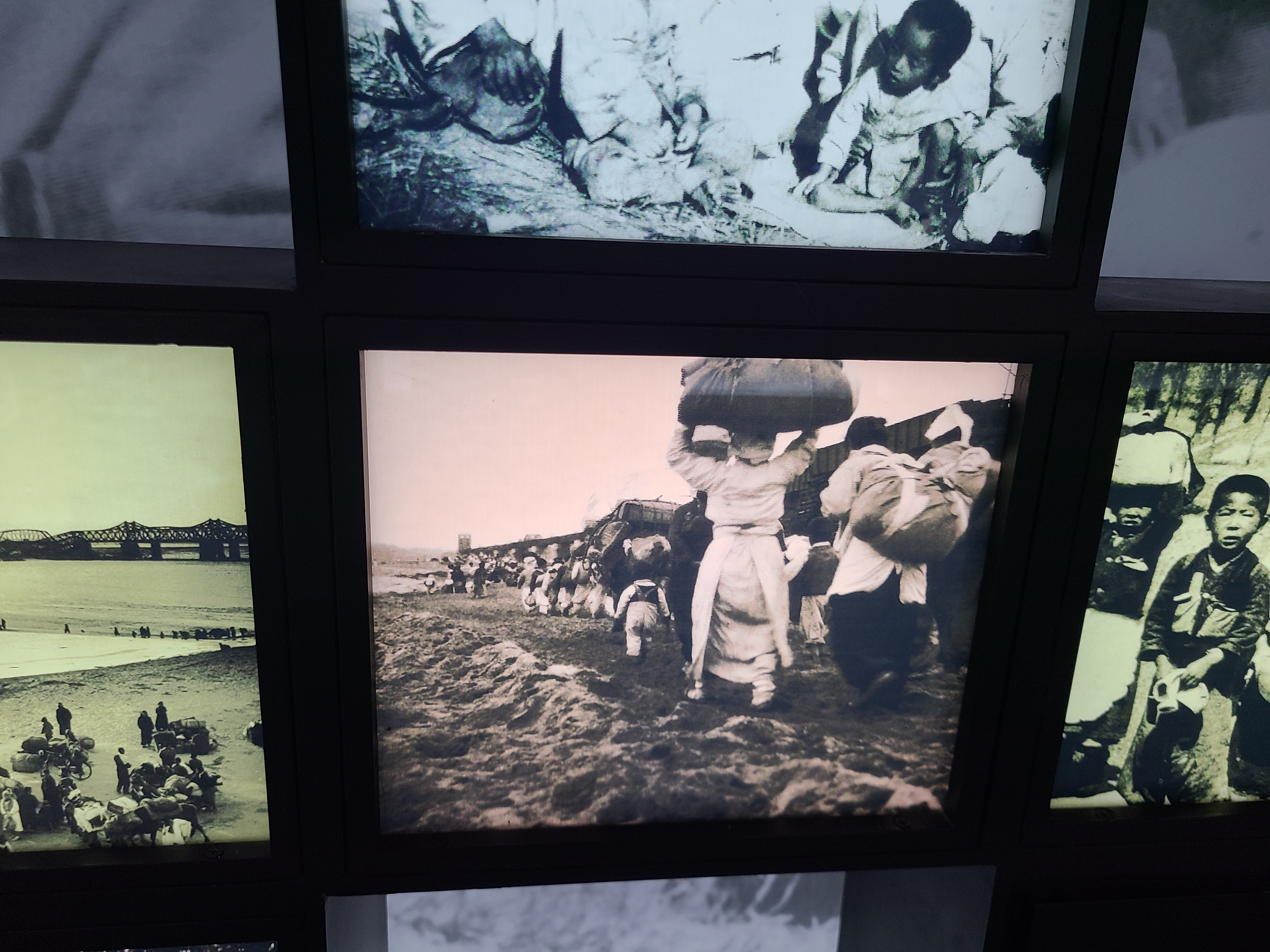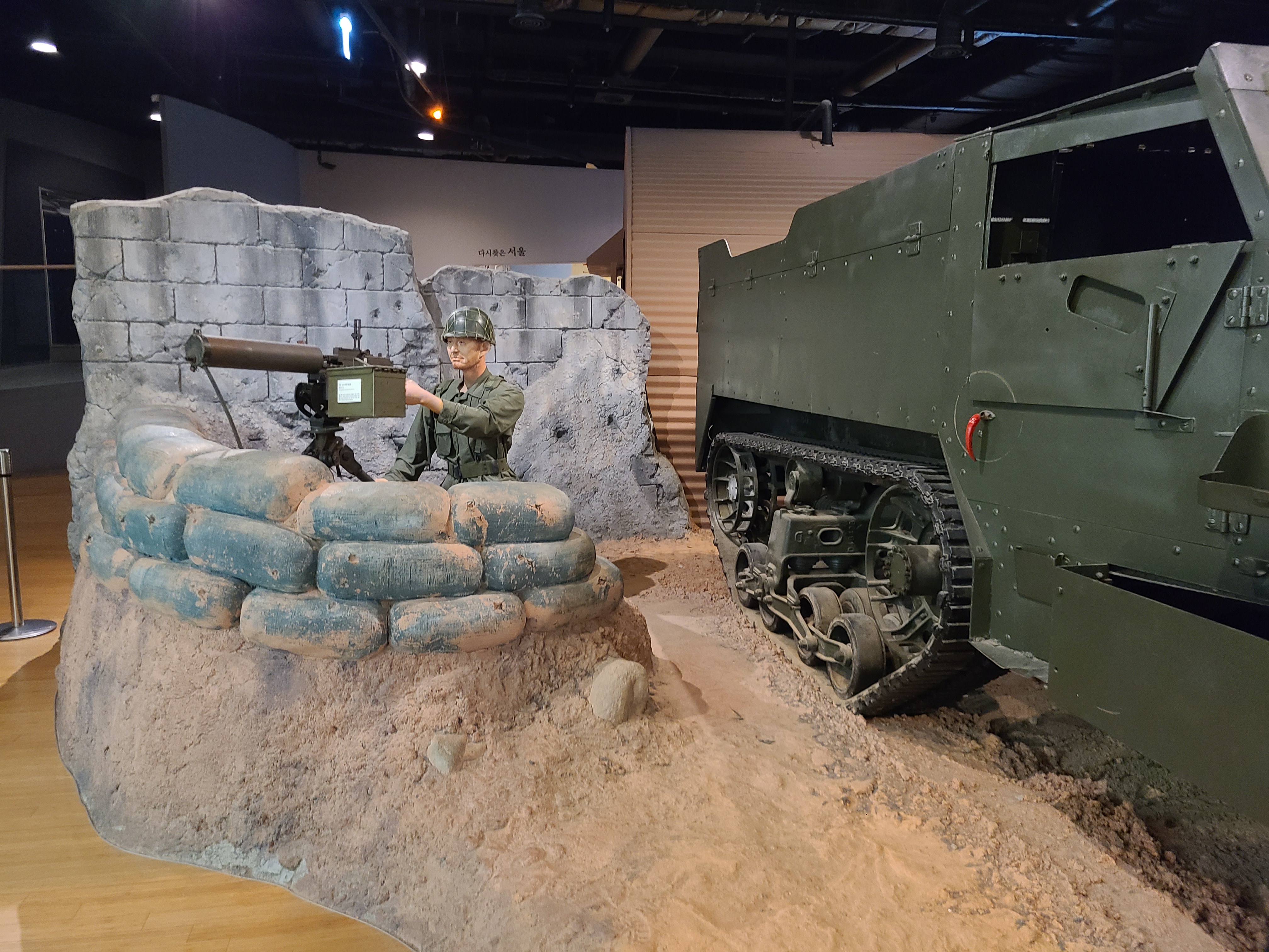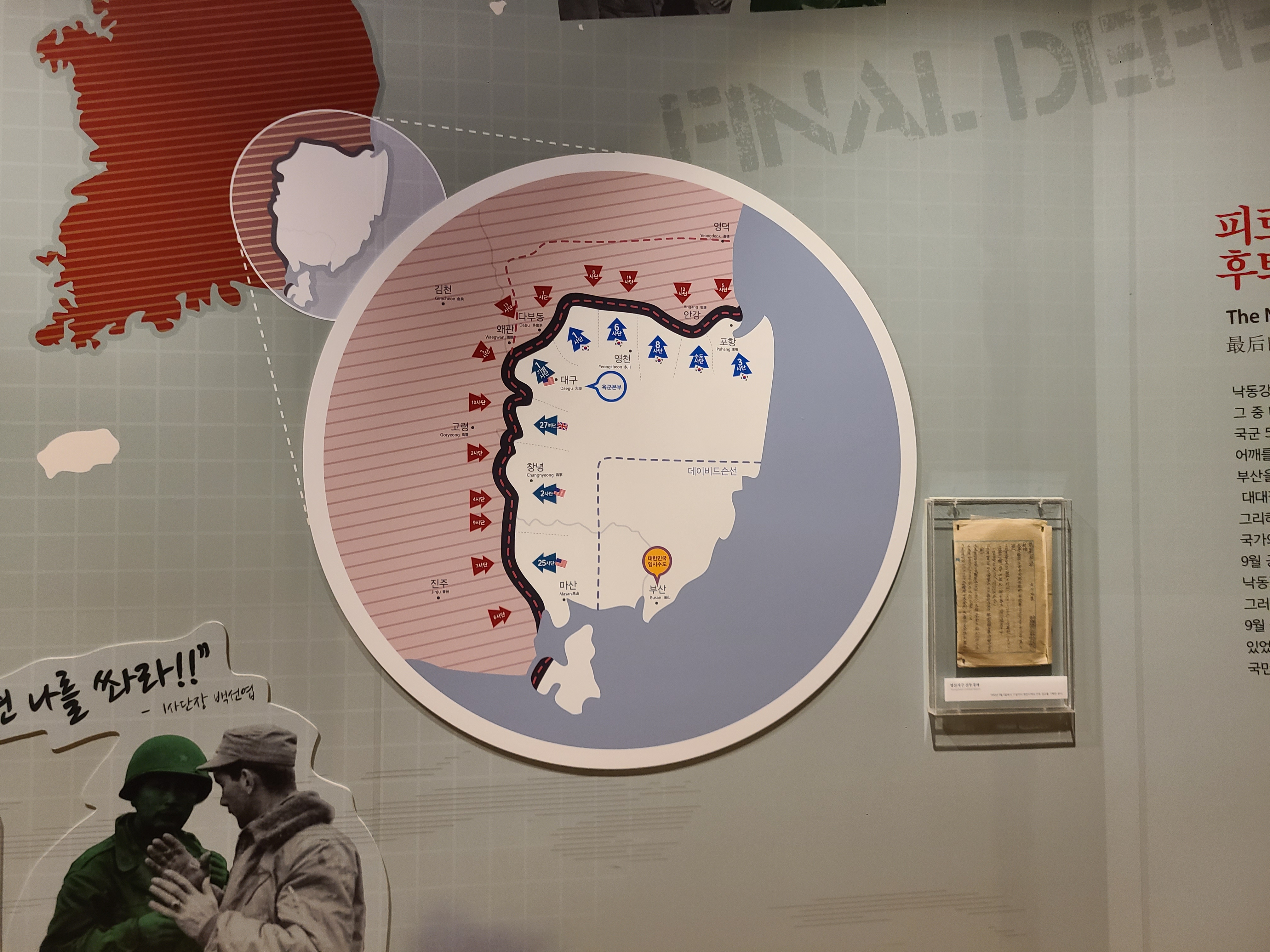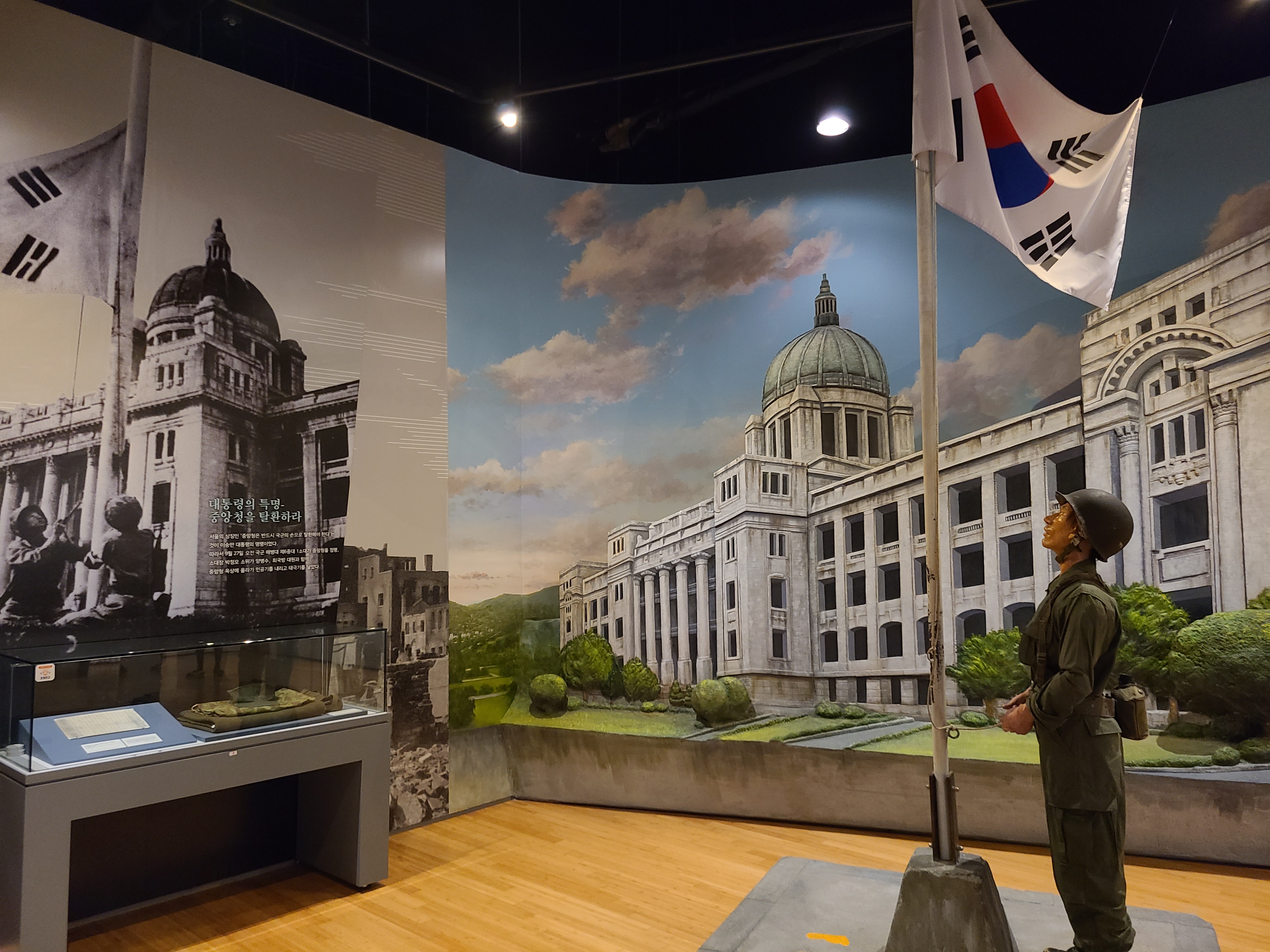 6.25 전쟁의 지도자들의 사진이 전시되었다. 왼쪽 부분에 6.25 전쟁의 양상을 바꾸었던 맥아더 장군의 사진도 있다. 많은 사람들이 희생을 치른 6.25 전쟁. 부산까지 밀렸던 남한은 다시 서울을 되찾게 된다. 그리고 서울 시청 앞에 대한민국의 국기를 다시 게양하는 쾌거를 이루게 된다. 그리고 인천 상륙작전으로 전세를 뒤집은 한국과 동맹군들은 그 기세로 중국 국경 가까이까지 치고 올라가게 된다. 북한이 남한을 침공하기 전 중국과 러시아에게 동맹을 요청한 북한. 남한이 승리의 기세로 밀고 올라오기에 중국은 북한의 동맹국으로써 군을 파견한다. 그 이름 유명한, 인해전술의 시작이었다.