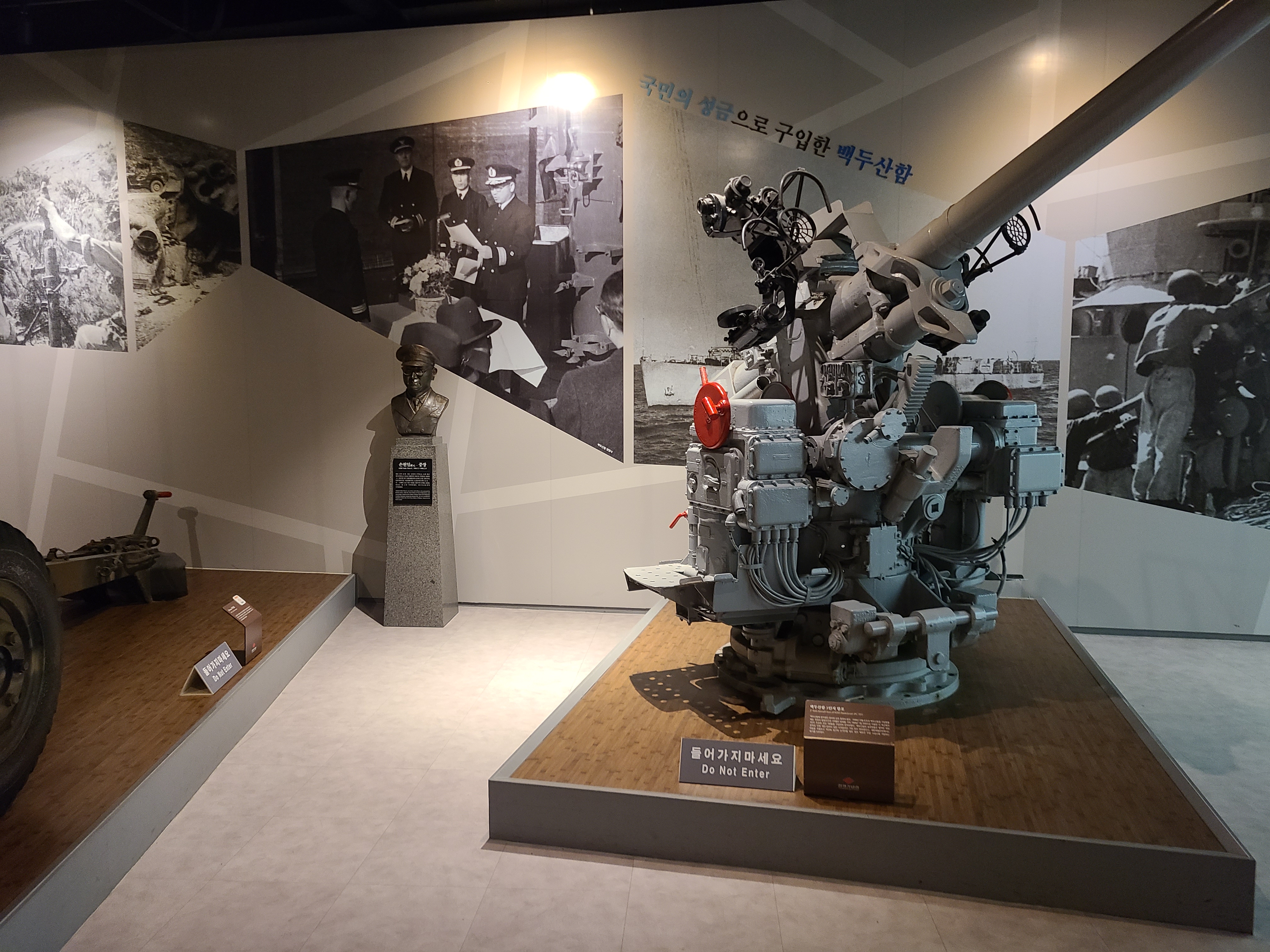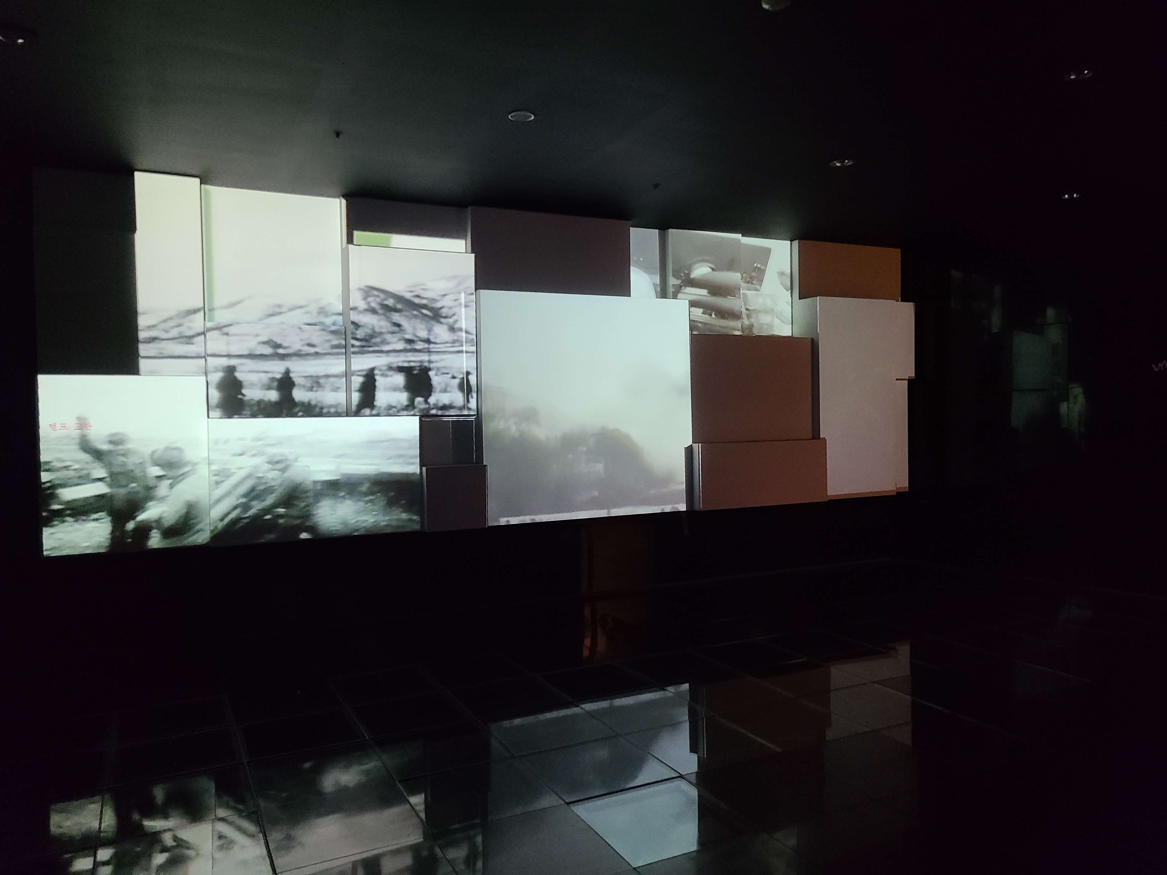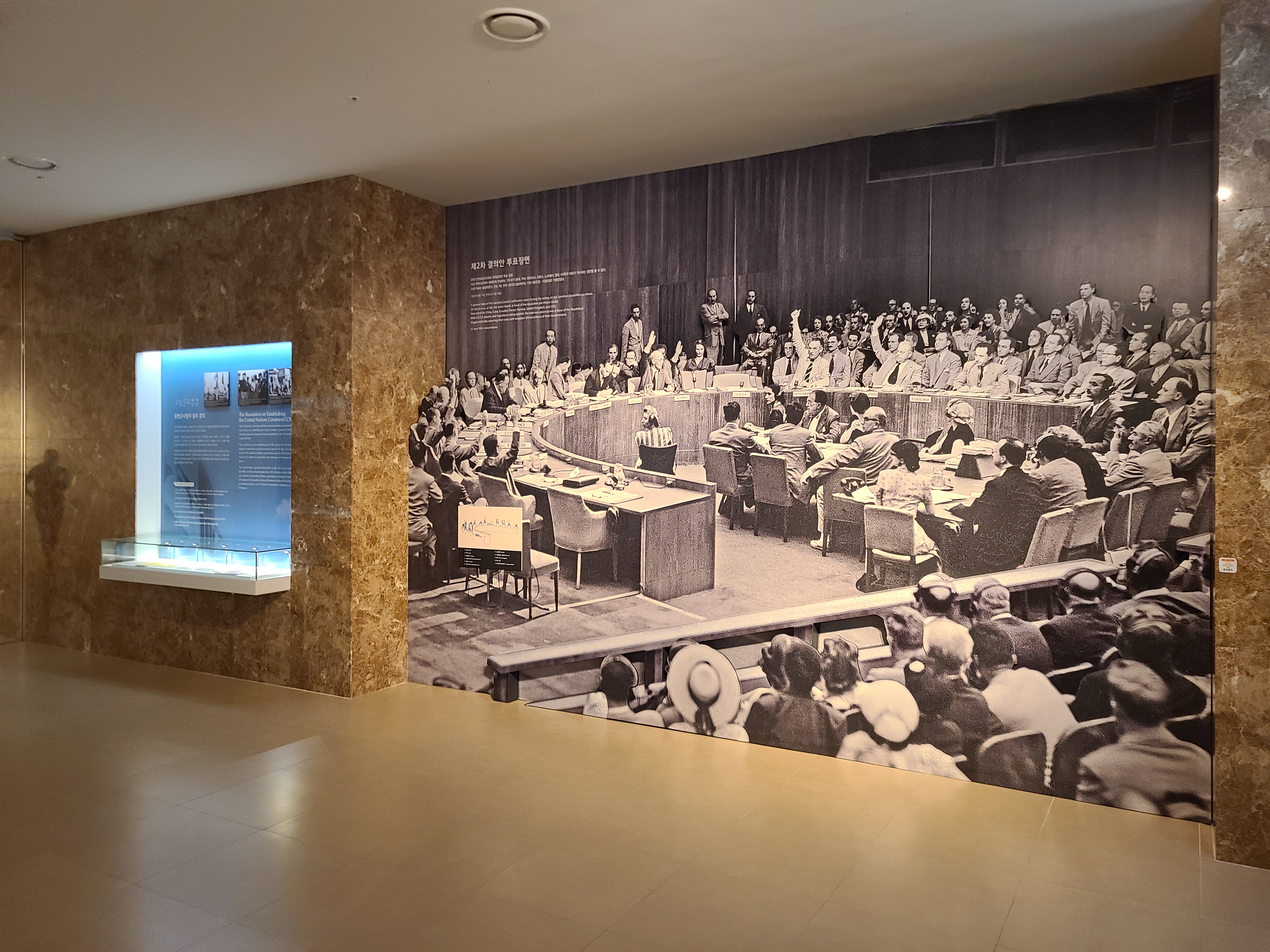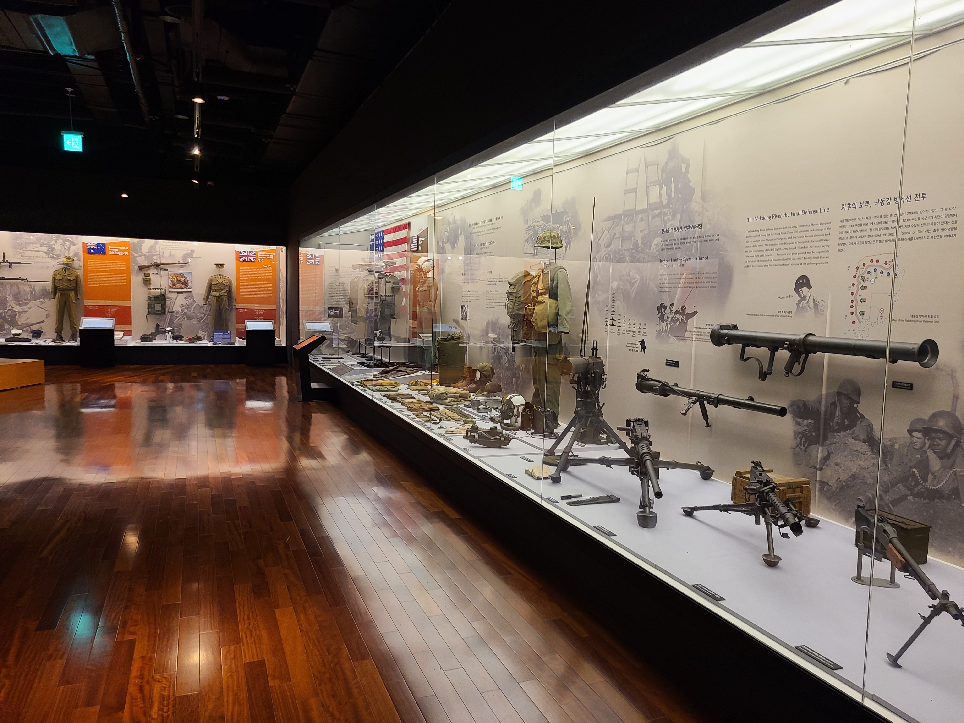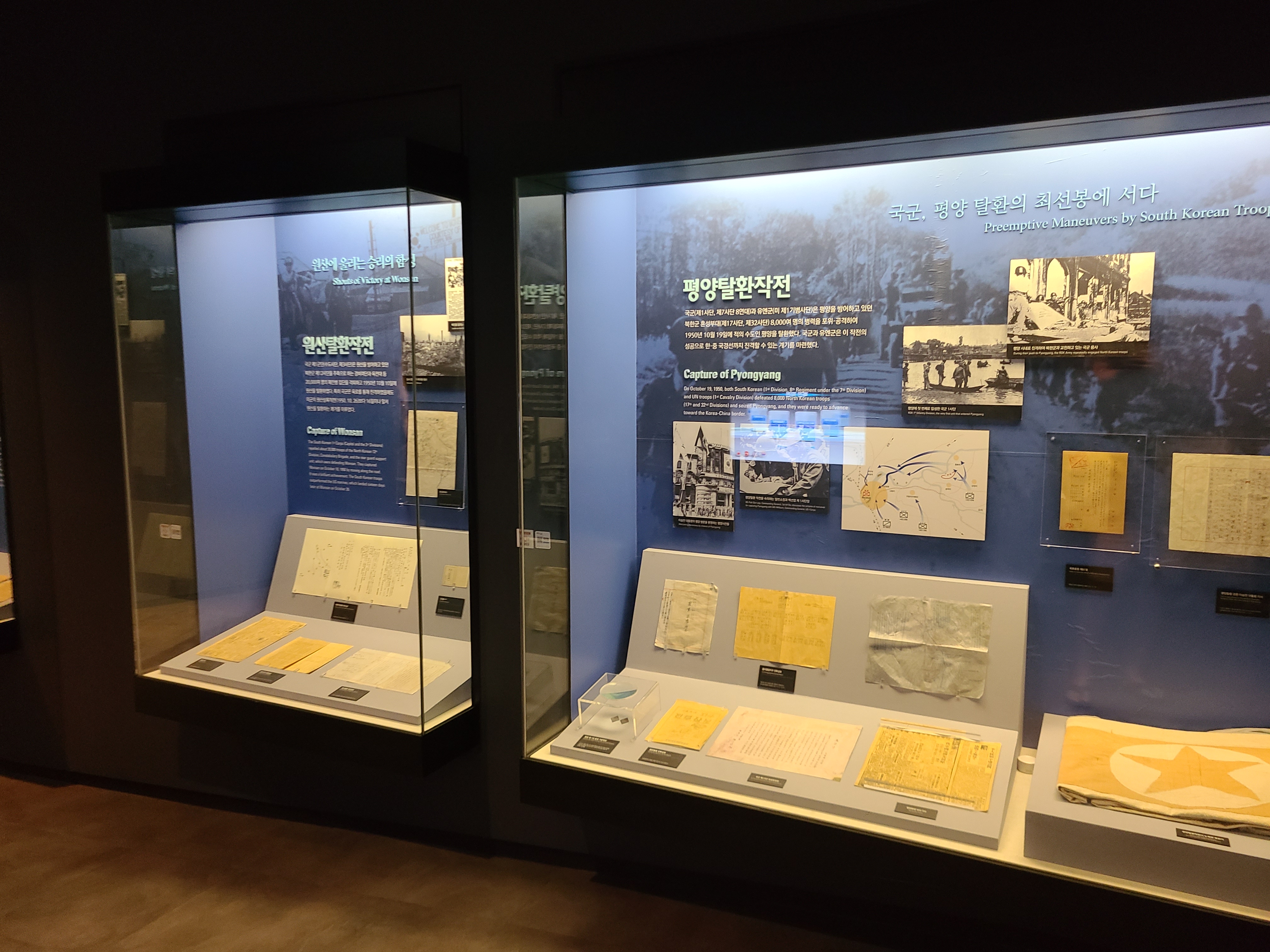 6.25 전쟁의 지도자들의 사진이 전시되었다. 왼쪽 부분에 6.25 전쟁의 양상을 바꾸었던 맥아더 장군의 사진도 있다. 많은 사람들이 희생을 치른 6.25 전쟁. 부산까지 밀렸던 남한은 다시 서울을 되찾게 된다. 그리고 서울 시청 앞에 대한민국의 국기를 다시 게양하는 쾌거를 이루게 된다. 그리고 인천 상륙작전으로 전세를 뒤집은 한국과 동맹군들은 그 기세로 중국 국경 가까이까지 치고 올라가게 된다. 북한이 남한을 침공하기 전 중국과 러시아에게 동맹을 요청한 북한. 남한이 승리의 기세로 밀고 올라오기에 중국은 북한의 동맹국으로써 군을 파견한다. 그 이름 유명한, 인해전술의 시작이었다.