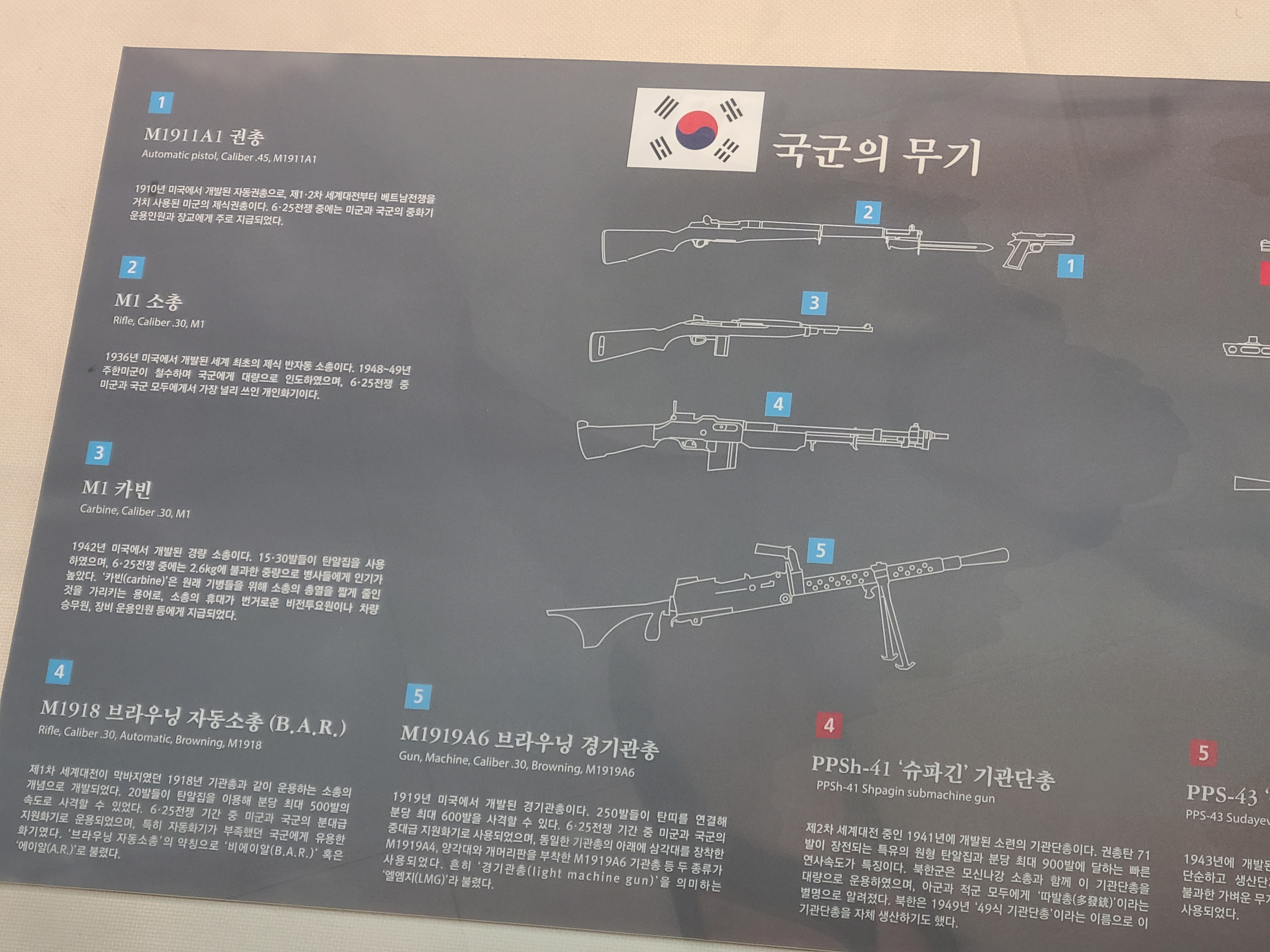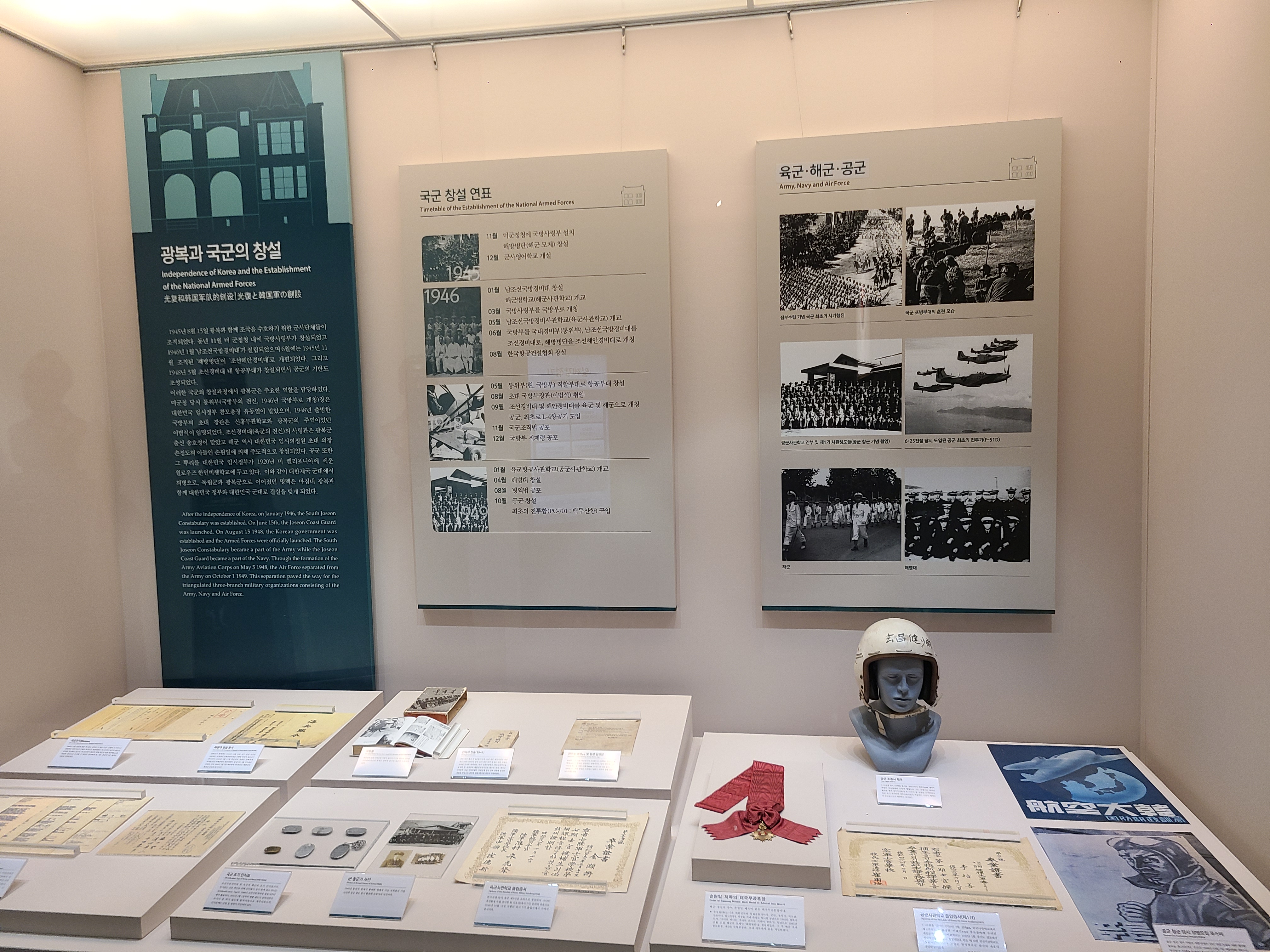조선시대를 끝내고 일제의 치하에서 해방된 후 국군이 창설되었다. 1945년 11월 육군 해군 공군 등 각 군이 창설되었고 정부 수립 기념 국군 최초의 시가행진이 시작되었다. 그 후로 남과 북이 갈라지는 6.25 전쟁이 발발되었고, 현재 남한은 세계 국방 7위의 군사 강대국이 되었다. 전쟁의 아픔과 교훈으로 다시는 전쟁이 되풀이되지 말아야 한다.
