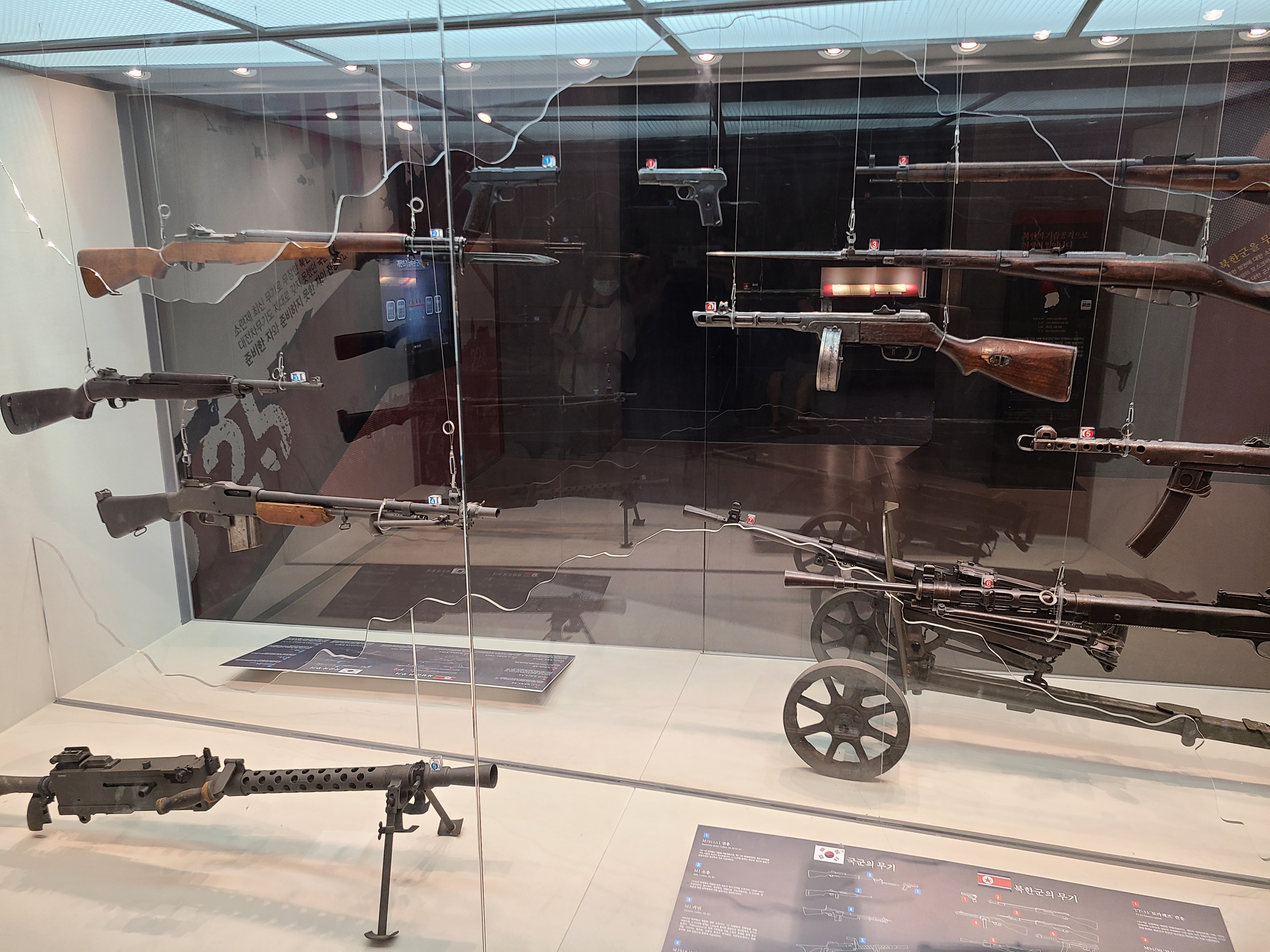 혹시나 했는데 역시나였다. 용산 전쟁기념관의 전시작품들은 지난 전쟁의 아픔에 대해서 너무나도 생생하게 전달해주고 있었다. 6.25 전쟁의 아픔과 고난이 시간이 지난 현재에도 고스란히 전해졌다. 소대원들이 모여서 전쟁의 참혹함을 전달해주는 동상들을 보니 마음이 숙연해졌다. 6.25 전쟁이 왜 일어났는지, 어떤 계기로 남북한이 둘로 갈라졌는지, 6.25 전쟁의 양상은 어떠했는지 너무나도 잘 알 수 있는 전시물들이 하나둘씩 관람객에게 나타나게 되었다. 특히 남한과 북한의 무기들 비교 전시물이 있었다. 대체로 시대의 흐름이 비슷하여 무기의 차이는 그렇게 커 보이지는 않았다. 하지만 북한군의 무기 중에 기관단총이 좀 더 현대식으로 되어 있었고, 남한은 기관단총이 열세임을 짐작케 하였다. 하지만 고정형 기관총은 남한 것이 더 강해 보였다.