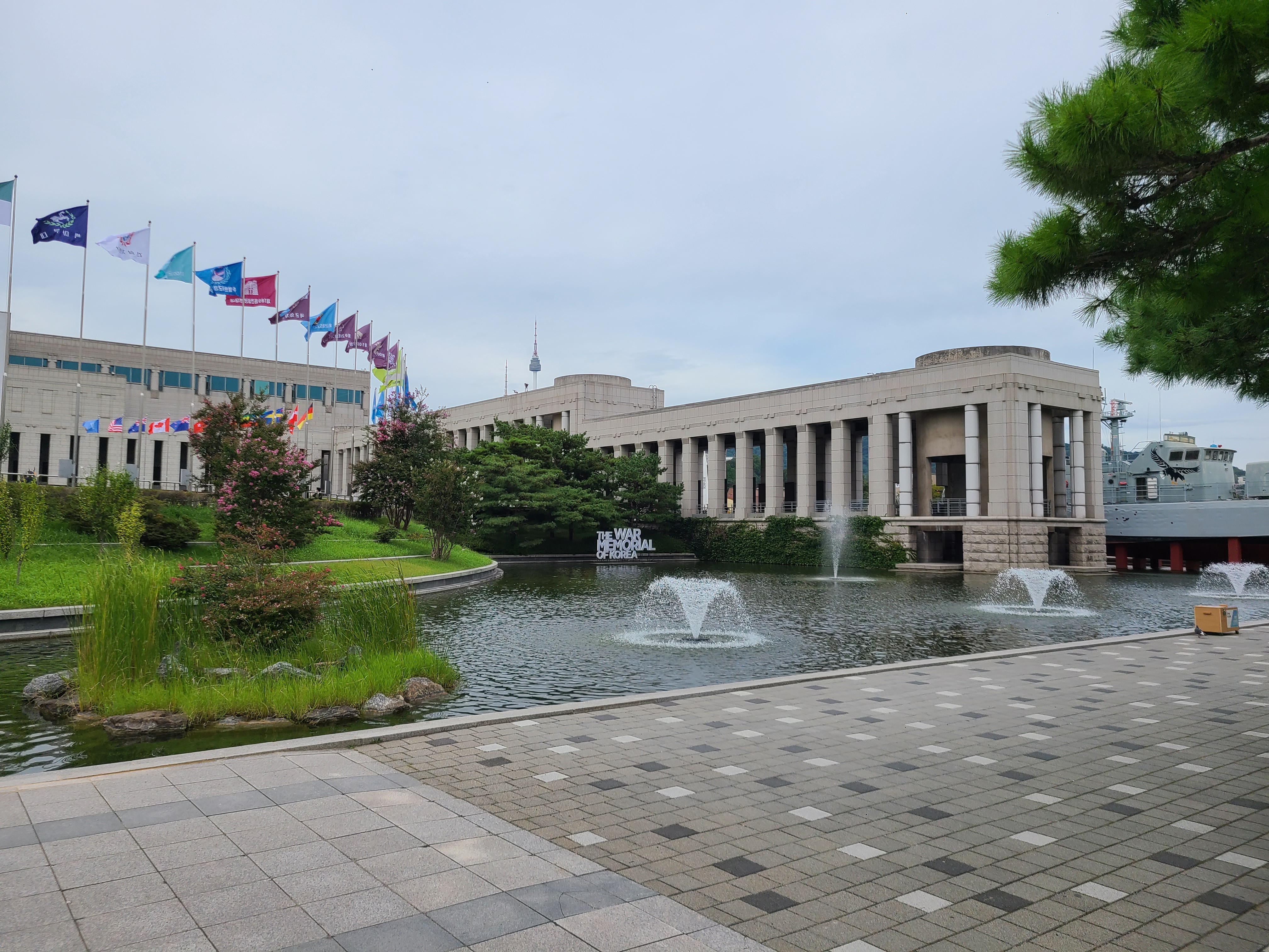 커다란 조각상을 통과하니 널찍한 분수대와 국기들이 보였다. 우리나라의 국방을 수호하는 각 군부대의 상징인 깃발과 나무들이 조화롭게 어우러져 있었다. 건물의 첫 느낌은 사치스럽지도 않고 그렇다고 초라해 보이지도 않은 절제된 느낌이었다. 전쟁기념관에 걸맞은 느낌이 이런 것일까? 전쟁기념관 내부를 관람하기 앞서 설렘이 가득해온다.