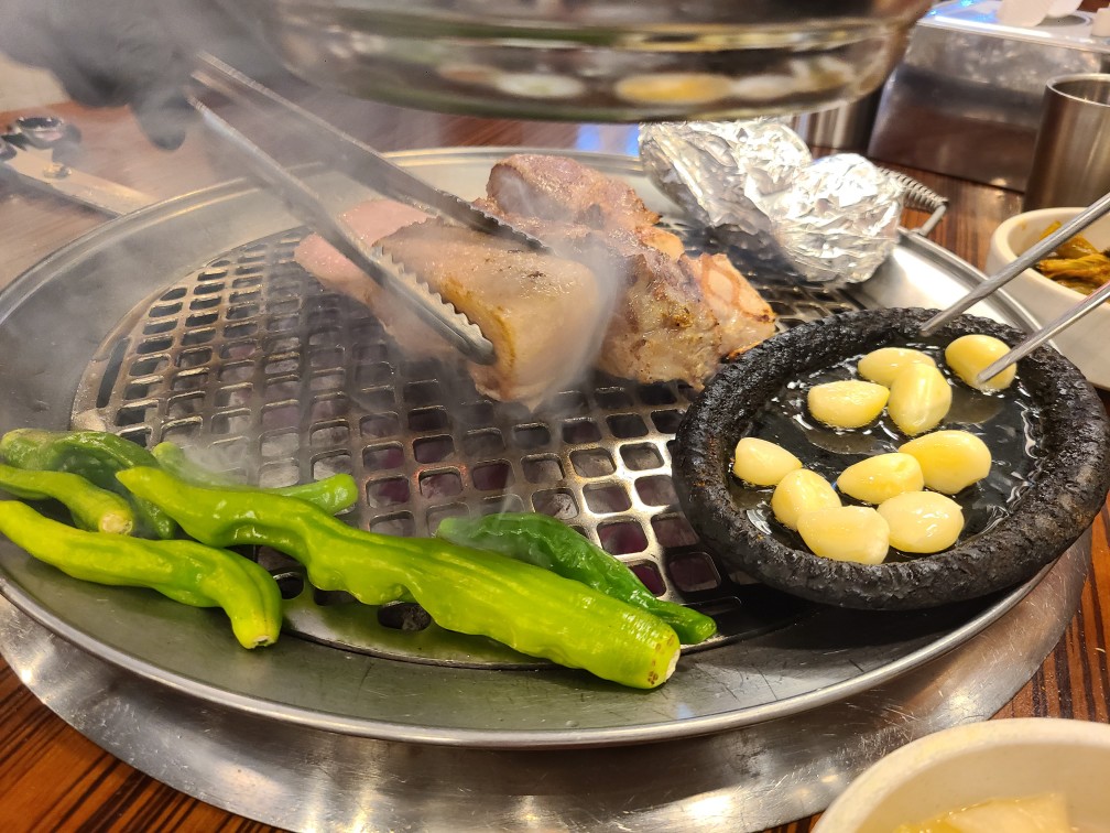 처음엔 목살을 시켰습니다. 불판 위에 버섯과 꽈리고추를 올려주셨고, 마늘에 참기름을 뿌려 돌판 위에 올려져 나왔어요.