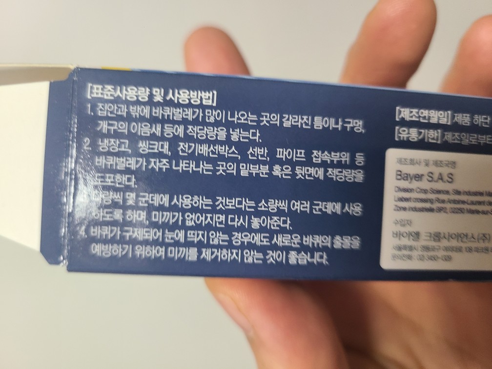 약국이나 마트에 바퀴벌레 살충제들은 여럿 팔고 있습니다. 효과는 비슷비슷하나 제 경험상 가장 효과 좋은 방법을 알려드릴게요. 프랑스에서 수입되어 약국에서 구입할 수 있는데, 살충 성분이 가장 강력하고 위에 말씀드린 것처럼 바퀴가 맛있게 처먹고 집으로 돌아갈 때 즈음 효과가 발현되어 서식지를 초토화시켜버리는 약입니다.