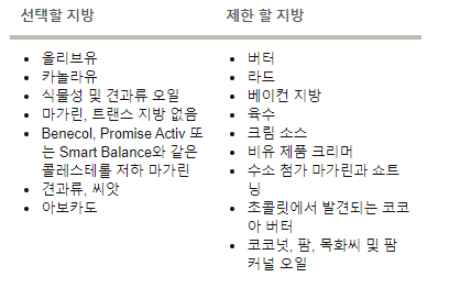 미국 심장 협회는 심장 건강에 좋은 식단에 얼마나 많은 지방을 포함해야하는지에 대한 다음 지침을 제공합니다.