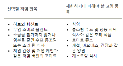 건강한 성인의 나트륨은 하루에 2,300mg이하입니다 (소금 1 티스푼 정도).