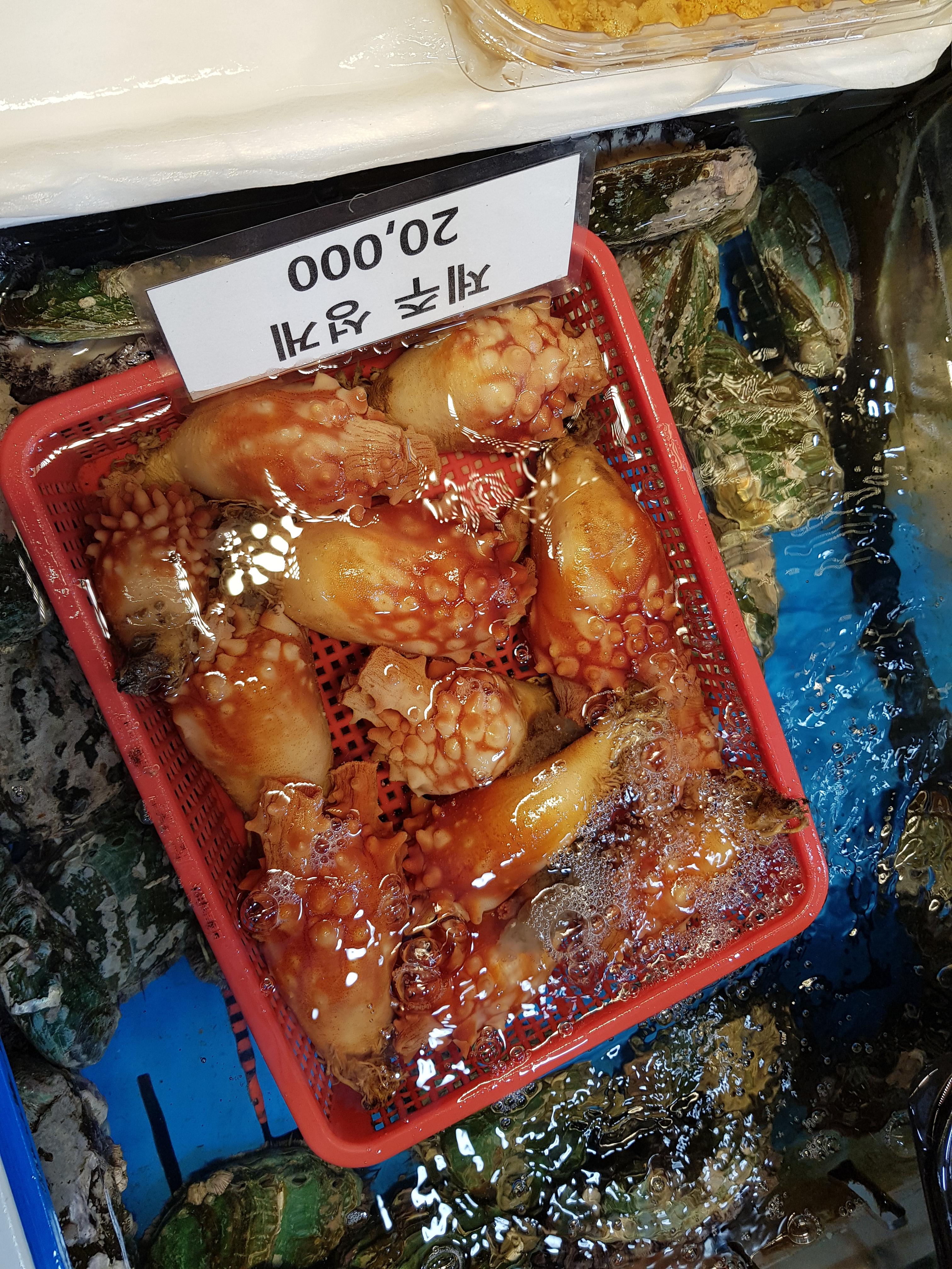 동문시장을 좀 더 둘러보고 도착한 수산가게. 멍게가 아주 실하고 색이 뚜렸했다. 한 바구니에 1킬로그램정도 였다.