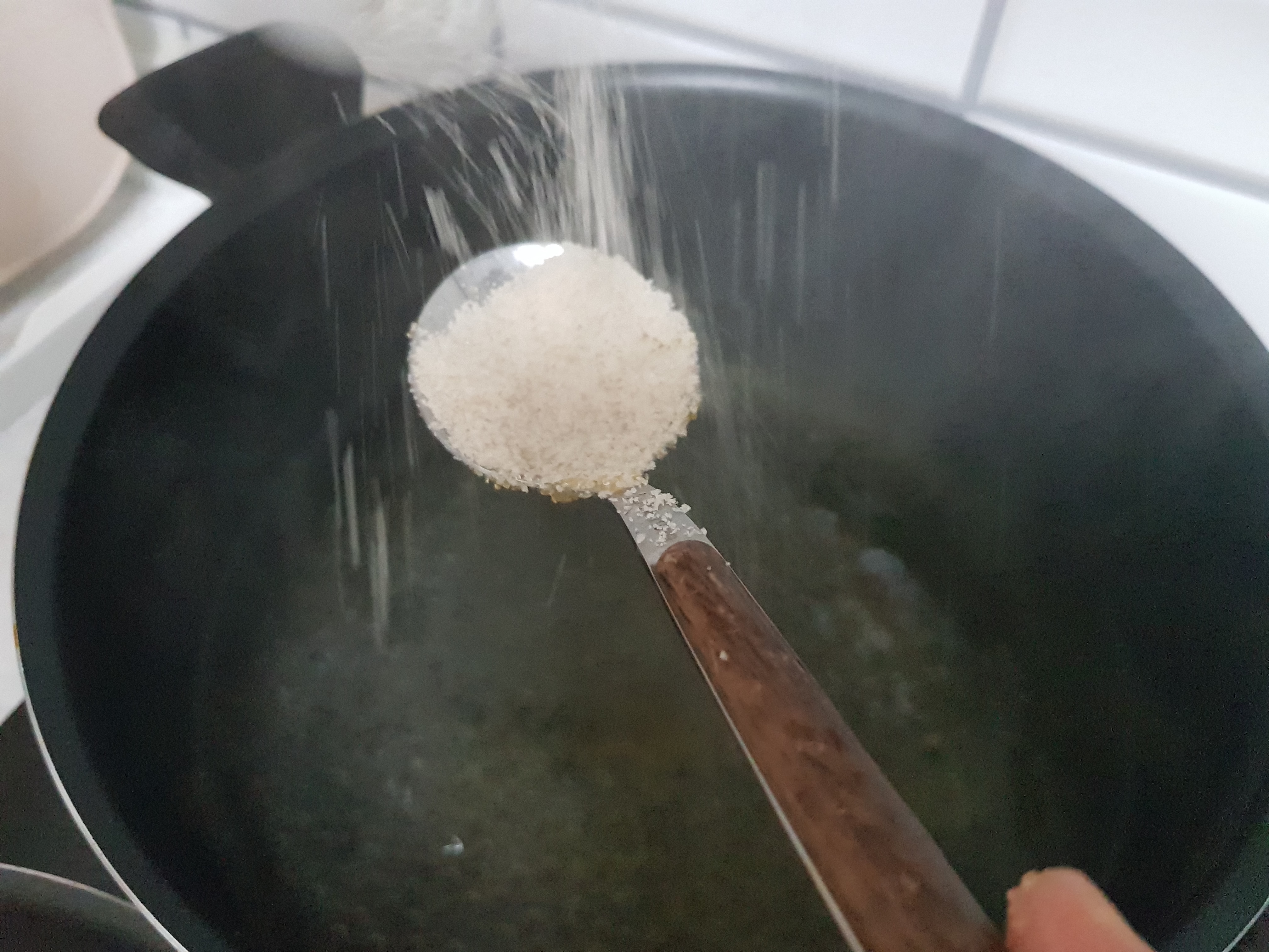옥수수 맛있게 삶는 방법 3번째. 끓는 물에 설탕 2 큰 술과 소금 1 큰 술을 넣고 녹여주세요. 옥수수의 간이 배어야 맛있는 옥수수를 먹을 수 있기 때문에 설탕과 소금을 꼭 같이 넣고 삶아주세요. 아까 씻어놓은 옥수수수염도 같이 넣어주세요.