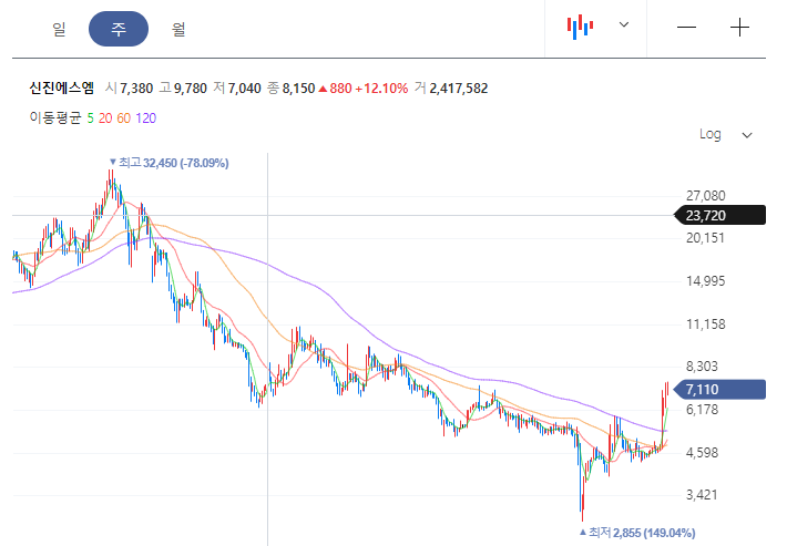 월봉과 비슷한 흐름이 보이고 있습니다. 월봉과 주봉으로 살펴보았을 때, 신진에스엠의 현재 가격은 저점매수의 큰메리트를 보이고 있습니다.
