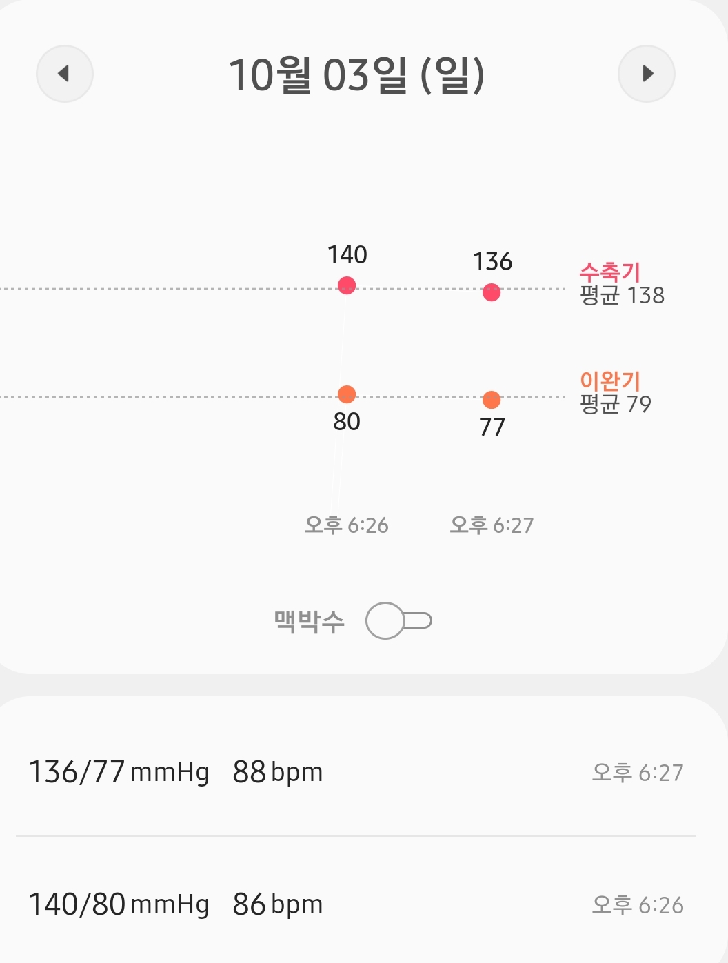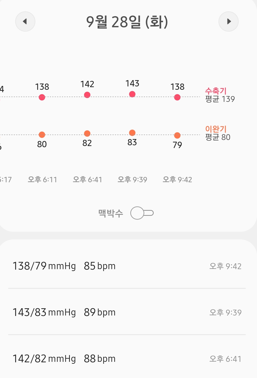 평소보다 혈압이 20% 증가한 현상은 계속 이어졌고, 가슴 답답함과 숨이 찬 느낌이 조금 사라졌습니다. 3일 차 까지는 조금만 걸어도 숨이 차던데, 이러한 증상은 많이 개선되었습니다. 그리고 밤에 잠들기 직전 식은땀이 나는 것은 사라지지 않았네요.