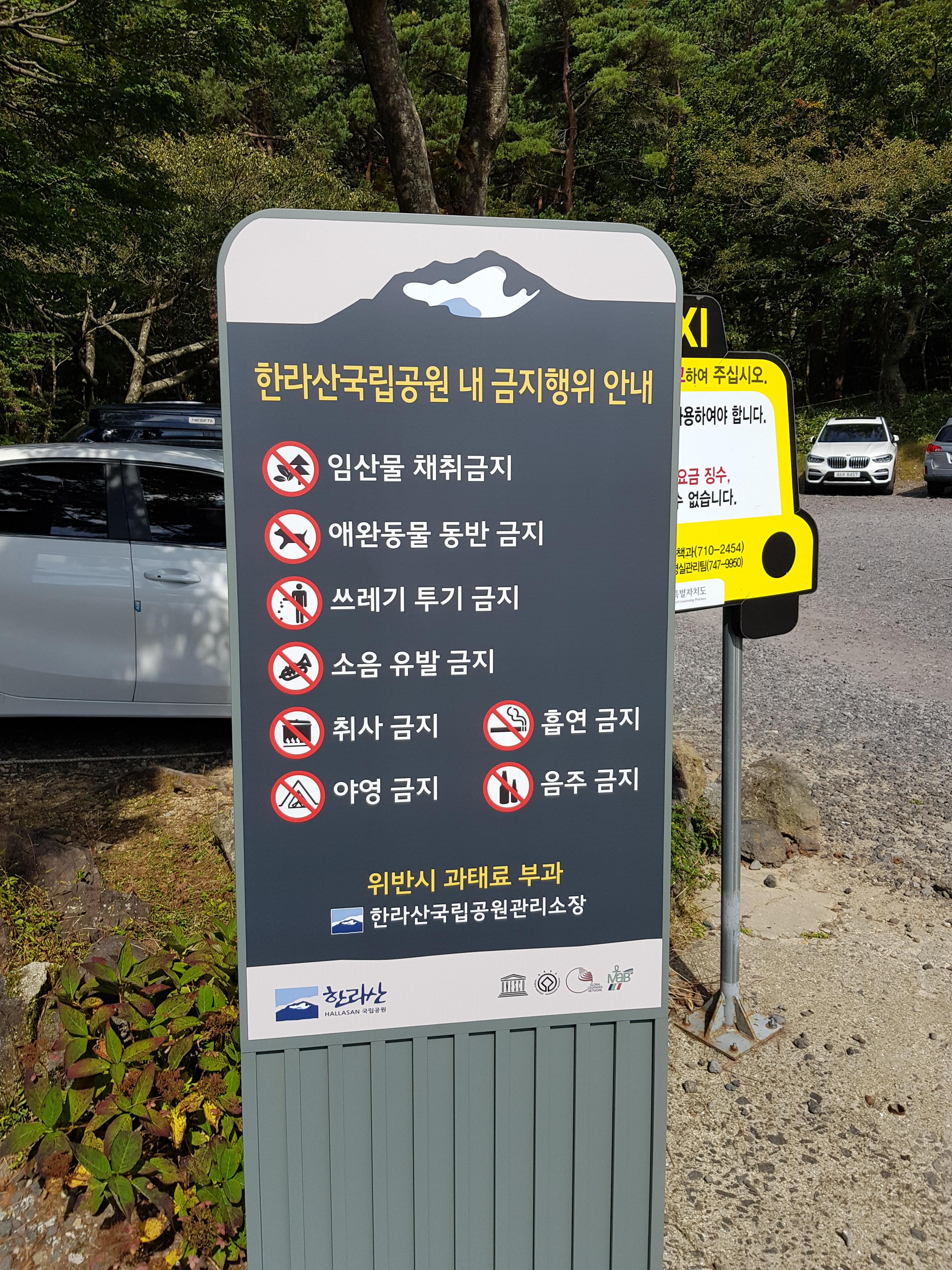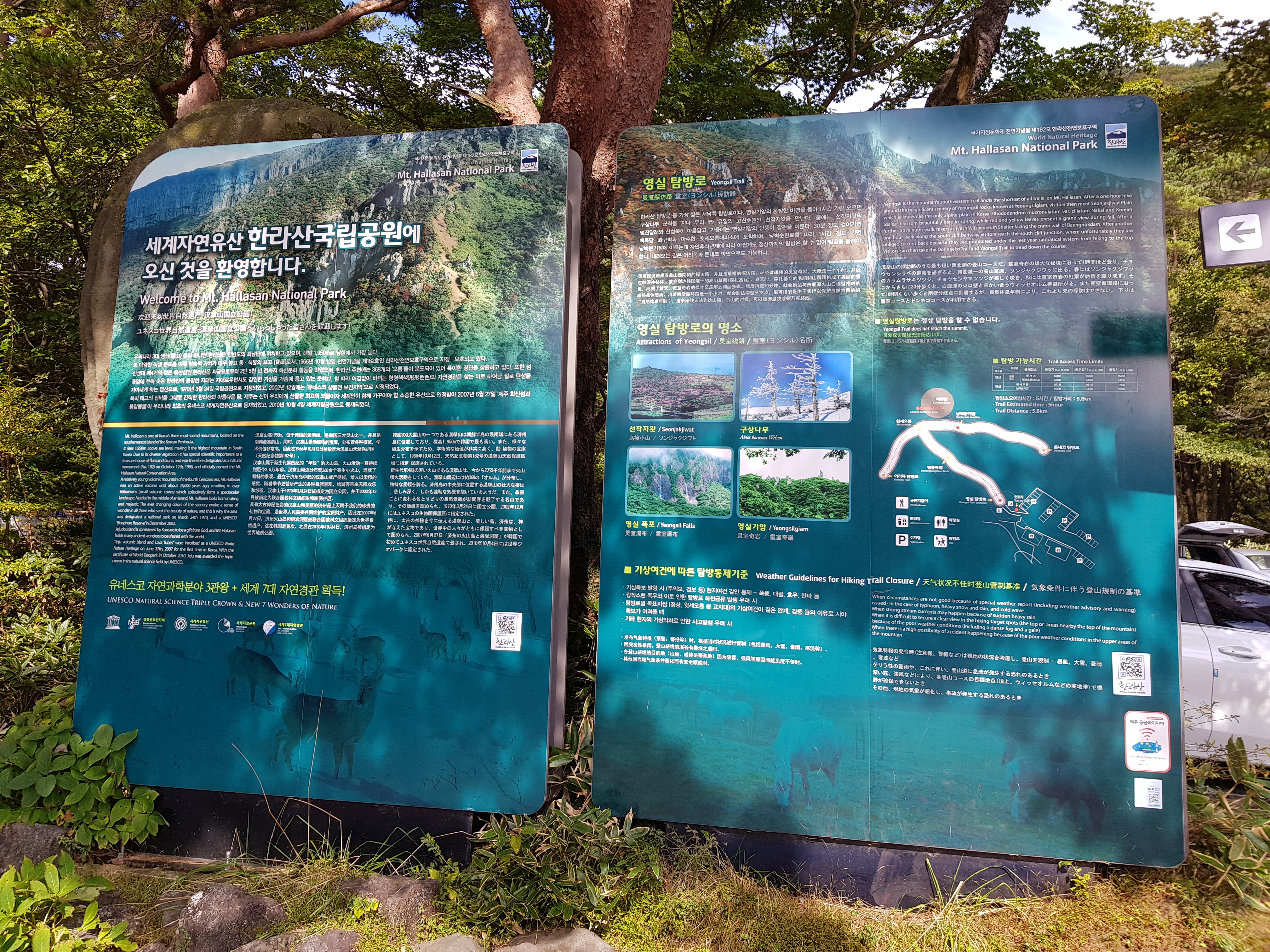 등산로 입구에 세계 자연유산 한라산국립공원에 오신 것을 환영합니다라고 등산객들을 반기고 있습니다. 한라산에 대한 이야기, 코스 종류 등을 설명해주네요. 우리나라 3대 영산 중의 하나인 한라산은 한반도의 최남단에 위차하고 있으며, 해발 1950m로 남한에서 가장 높습니다. 또 다양한 식생 분포를 이뤄 학술적 가치가 매우 높고, 동식물의 보고로서 1966년 10월 12일 천연기념물 제182호인 한라산 천연 보호구역으로 지정, 보호되고 있습니다. 신생대 제4기의 젊은 화산섬인 한라산은 지금으로부터 2만 5천 년 전까지 화산 분화 활동을 하였으며, 한라산 주변에는 368개의 오름들이 분포되어 있어 특이한 경관을 창출하고 있습니다. 또한 섬 중앙에 우뚝 솟은 한라산의 웅장한 자태는 자애로우면서도 강인한 기상을 가슴에 품고 있는 듯합니다. 철 따라 어김없이 바뀌는 형형색색의 자연경관은 찾는 이로 하여금 절로 탄성을 자아내게 하는 명산으로, 1970년 3월 24일 국립공원으로 지정되었고, 2002년 12월에는 유네스코 생물권 보전지역으로 지정되었습니다. 특히 태고의 신비를 그대로 간직한 한라산과 아름다운 땅, 제주는 신이 우리에게 선물한 최고의 보물이자 세계인이 함께 가꾸어야 할 소중한 유산으로 인정받아 2007년 6월 27일 제주 화산섬과 용암동굴이 우리나라 최초의 유네스코 세계 자연유산으로 등재되었고, 2010년 10월 4일 세계 지질공원으로 등재되었다고 합니다.