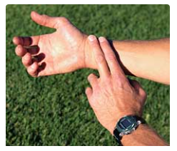- 한 손의 처음 세 손가락을 엄지 바로 아래에 있는 다른 손의 안쪽 손목에 대십시오.