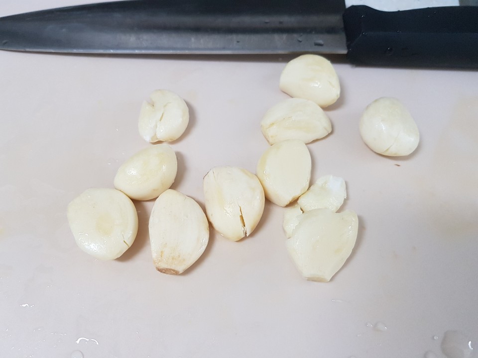 이제 쌀이 익었다면 통마늘과 전복을 넣어줍니다. 통마늘은 칼 면으로 살짝만 금이 가게 쪼개 주세요. 더욱 풍미를 좋게 합니다.