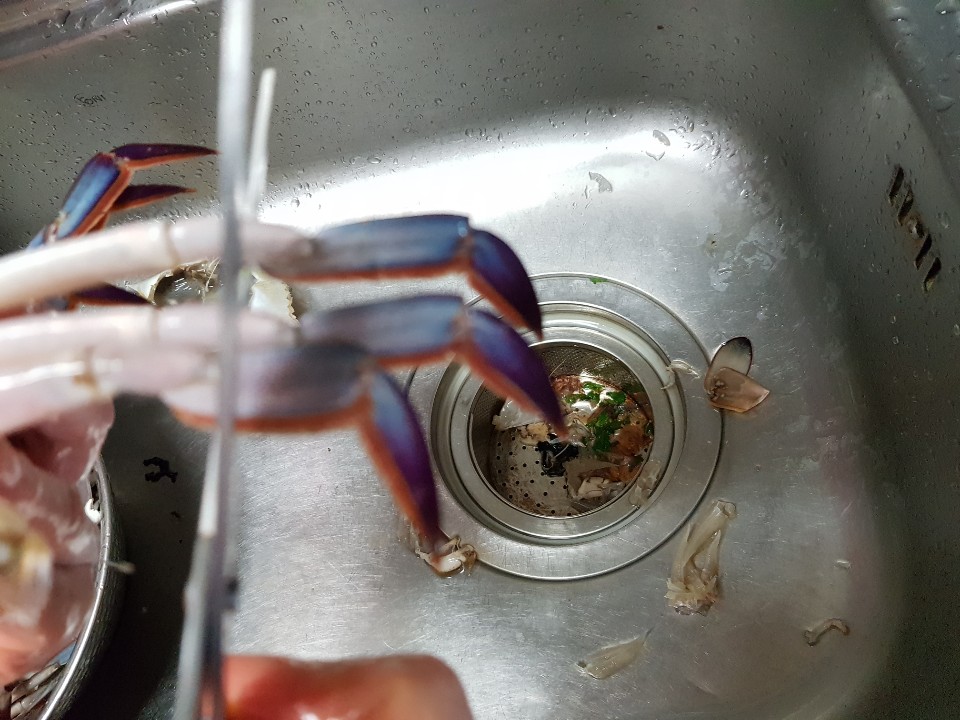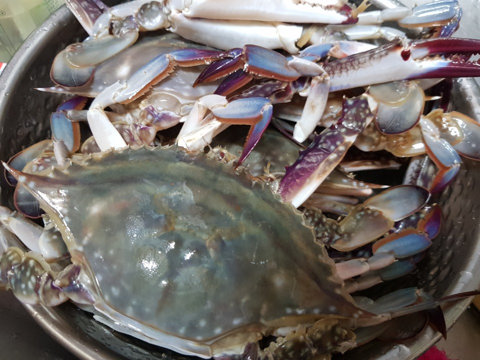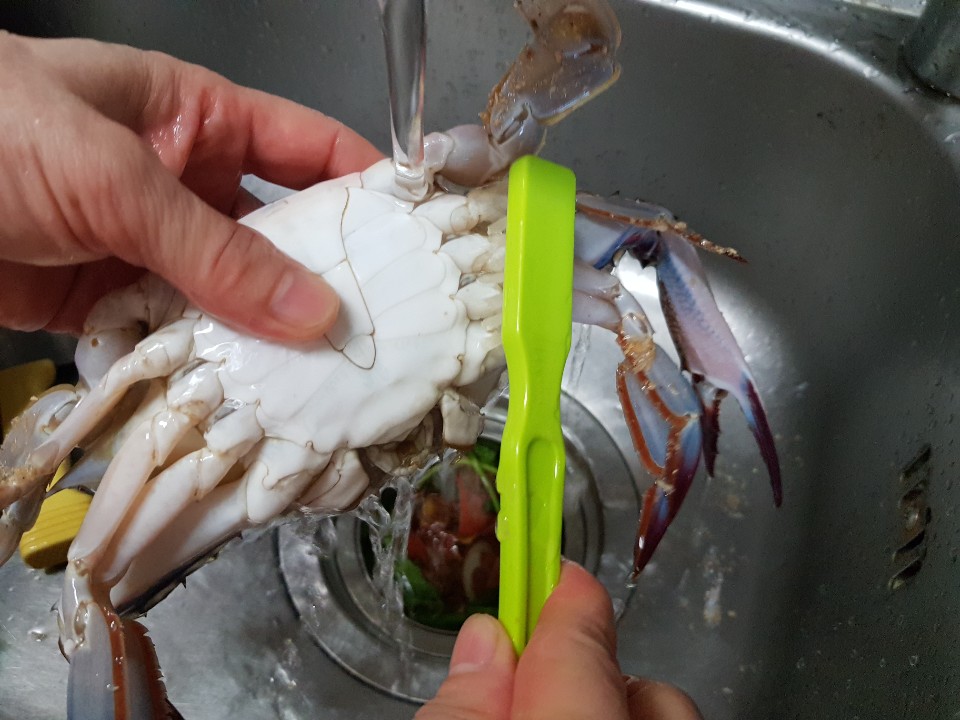 1. 살아있는 꽃게를 솔로 살살 씻어 세척해 줍니다. 이물질이 꽃게에 붙어 있기 때문에 꼼꼼하게 씻어줍니다.