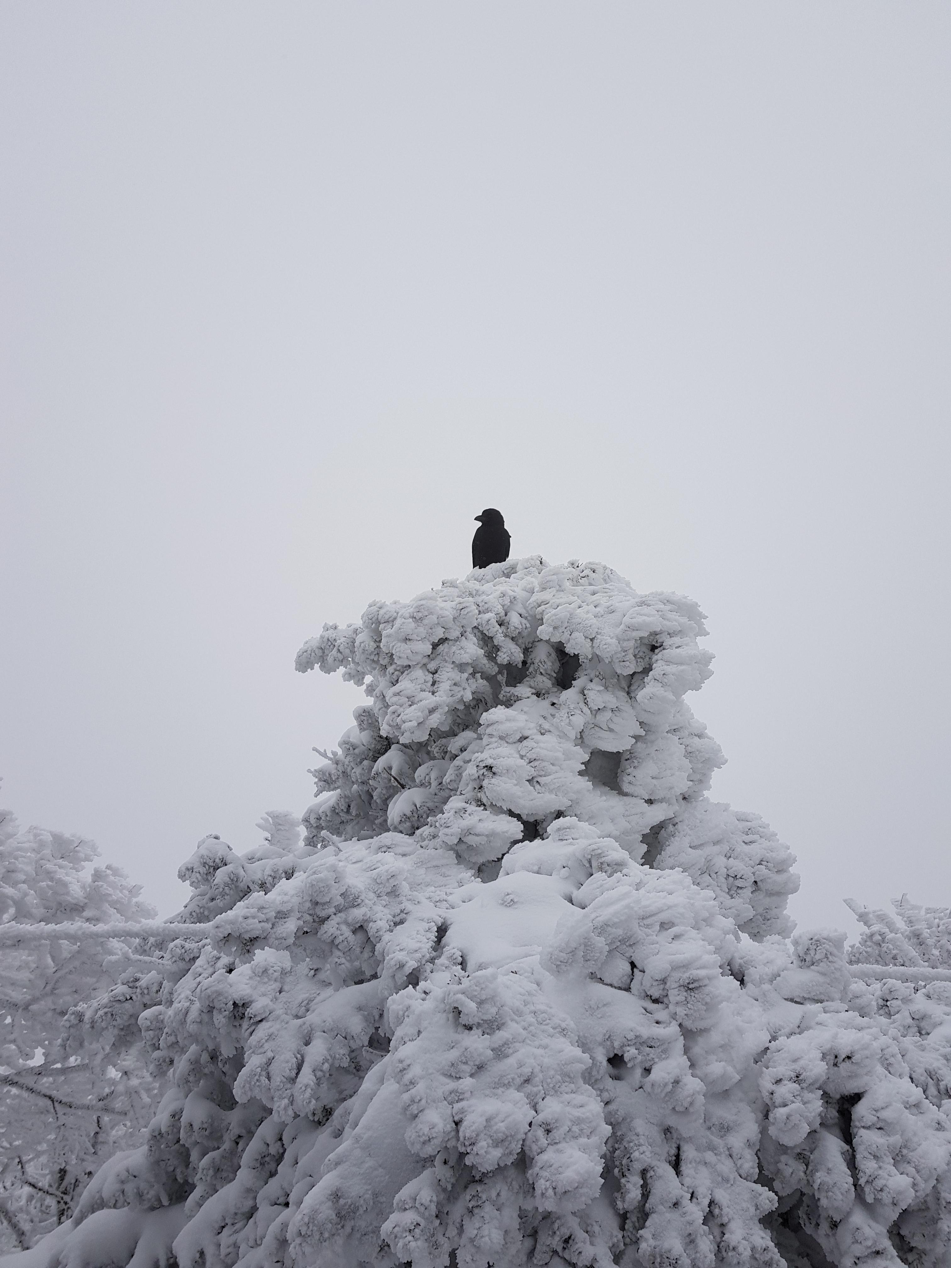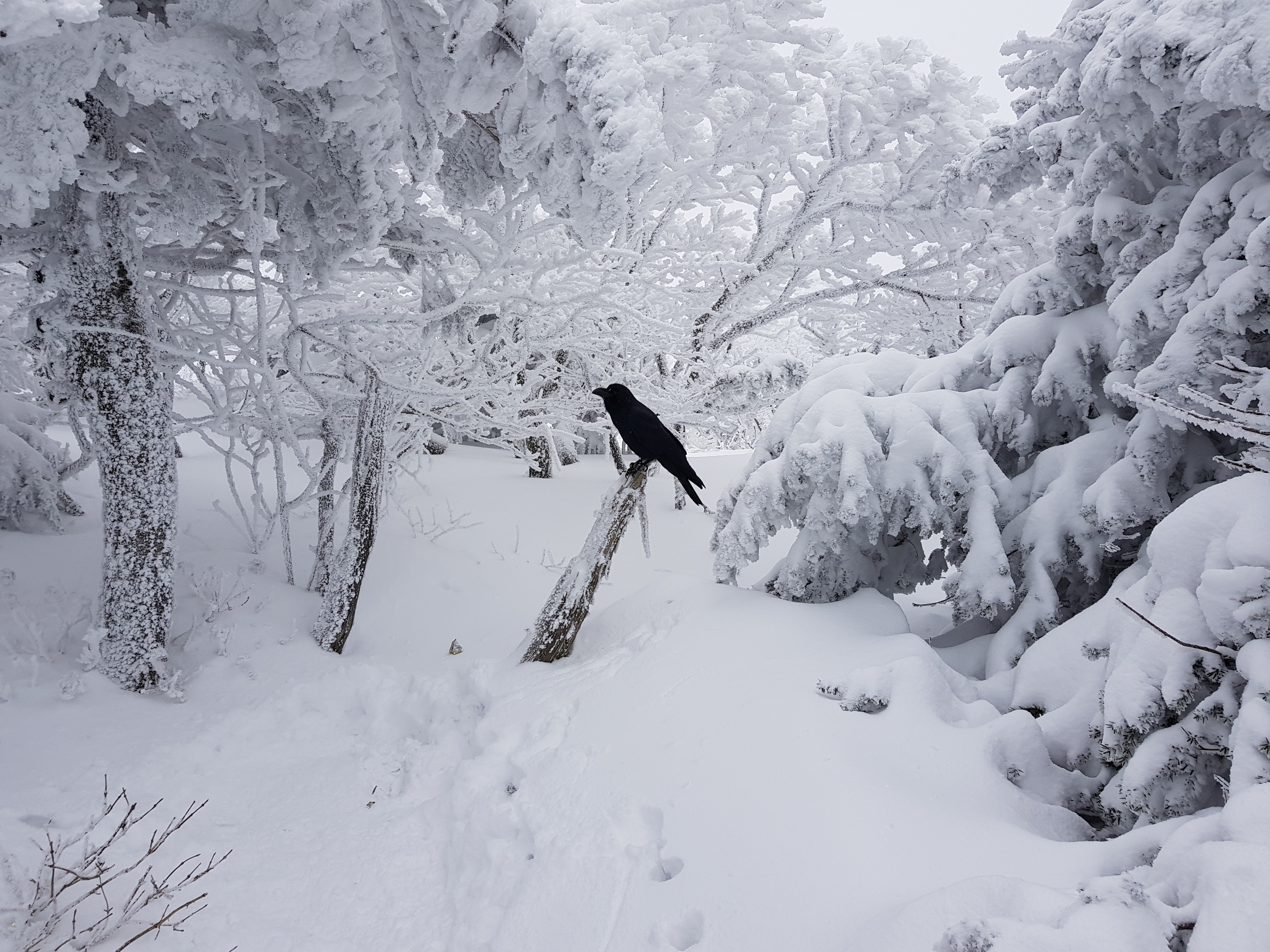 한라산엔 까마귀가 많이 서식하고 있습니다. 예전부터 까마귀는 길흉을 상징한다고 전해져오고 있으나, 생태학적으로는 까마귀가 까치보다 더 좋은 새라고 합니다. 주변환경을 파괴하지 않고 사람들에게 피해도 주지 않는다고 합니다. 한라산에 눈이 많이 내려 먹이가 부족했는지, 까마귀 한마리가 나무에 앉아 있네요. 귀여웠습니다. 까악까악