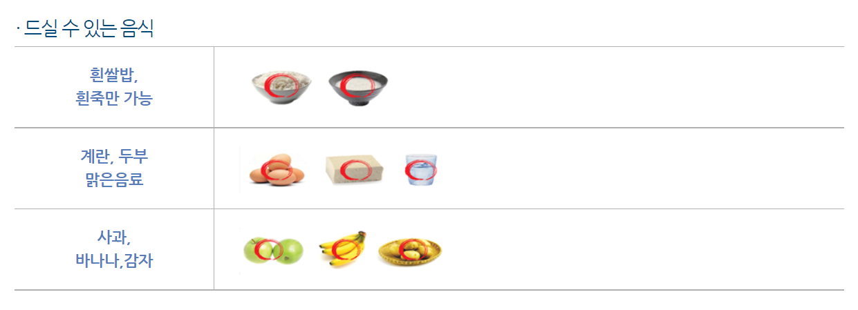 반면 대장내시경 전날에는 흰쌀밥이나 흰 죽과 아래와 같은 계란 두부 등 가벼운 음식으로 드시면 돼요.