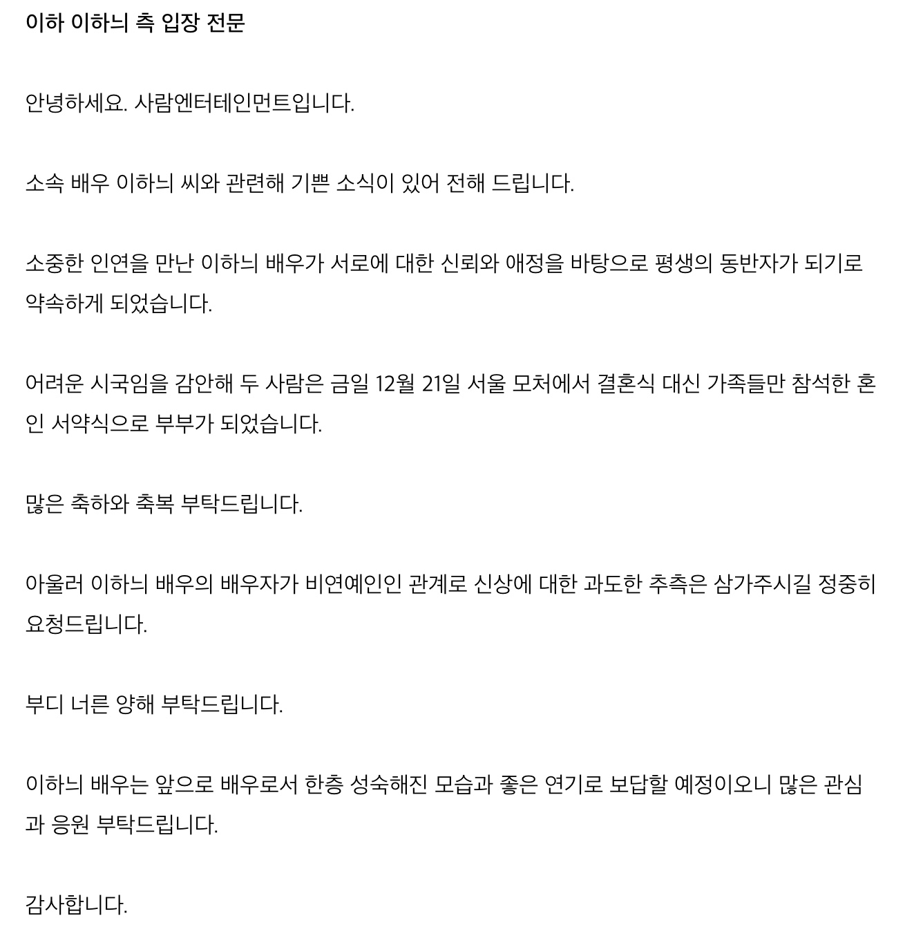 서로에 대한 신뢰와 애정을 바탕으로 평생의 동반자가 되기로 약속한 이하늬의 결혼 소식