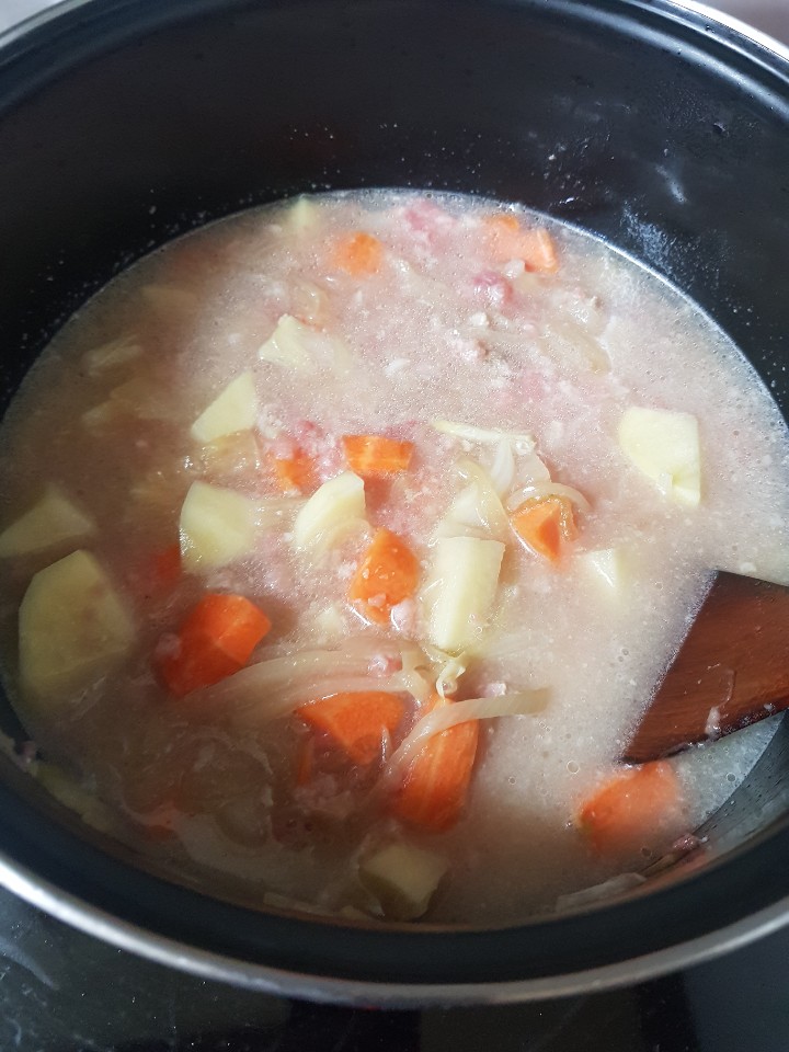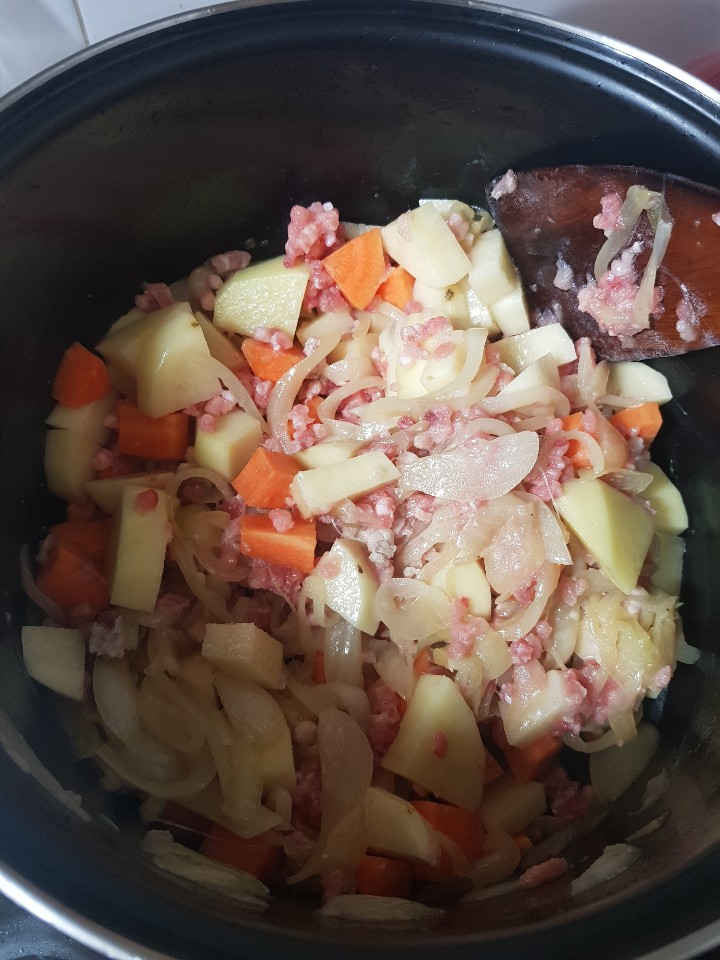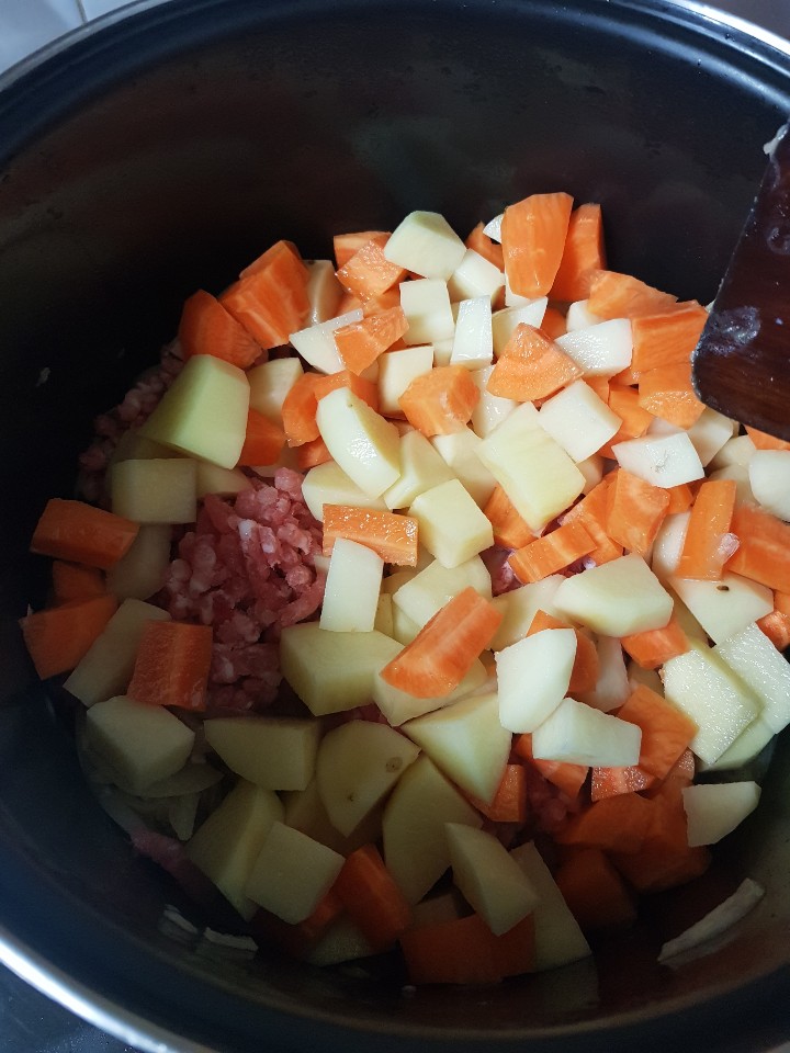 양파를 볶아서 캐러멜 라이즈를 시키고 그 위에 당근, 감자, 돼지고기를 넣고 살짝 볶음!