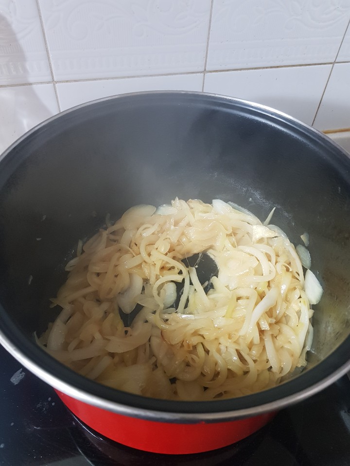 양파를 캐러멜 라이즈 해야 하기 때문에 중간 불로 젖어주면서 볶아야 해요.