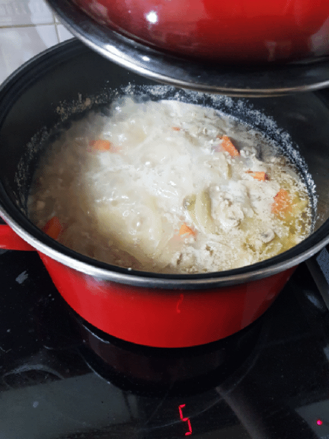 5. 돼지고기를 넣었기 때문에 거품이 조금 올라와요!