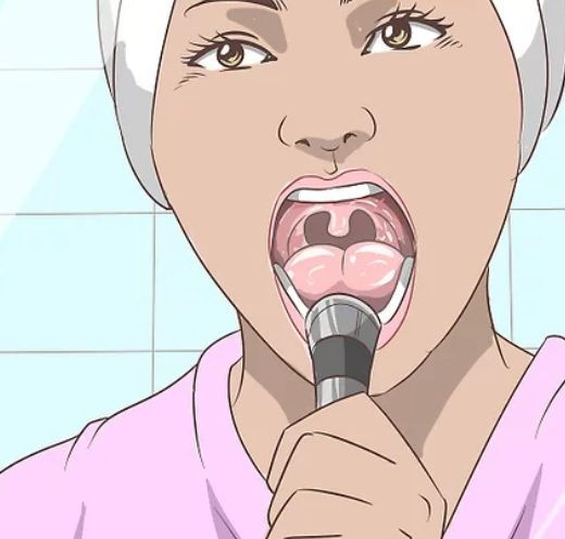 먼저 편도 결석이 잘 보이기 위해서는 편도에 힘을 줘야 합니다. 혀를 내밀고 목젖에 힘을 줍니다. "아" 소리를 내면 목 뒷부분의 근육이 조여지는데, 마치 가글을 하는 것처럼 해보면 편도가 앞으로 당겨지기 때문에 편도 결석이 잘 드러납니다.