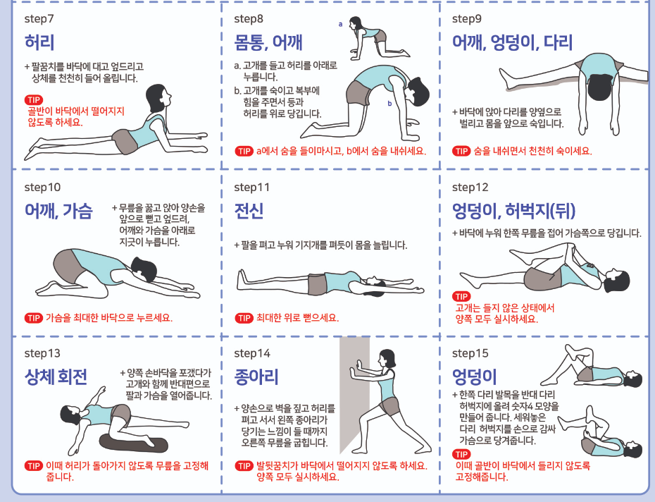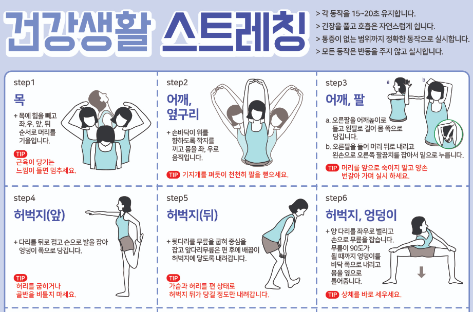 - 신체 활동을 시작하기 전과 후에 스트레칭을 해줘야 합니다.