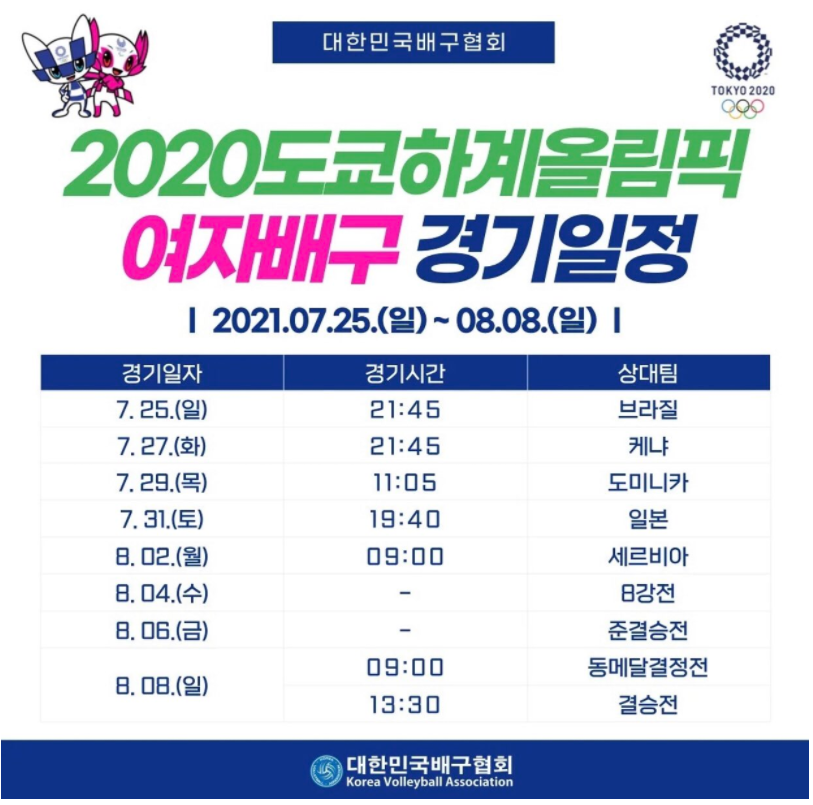 2. 도쿄올림픽 여자배구 대표팀 경기 일정