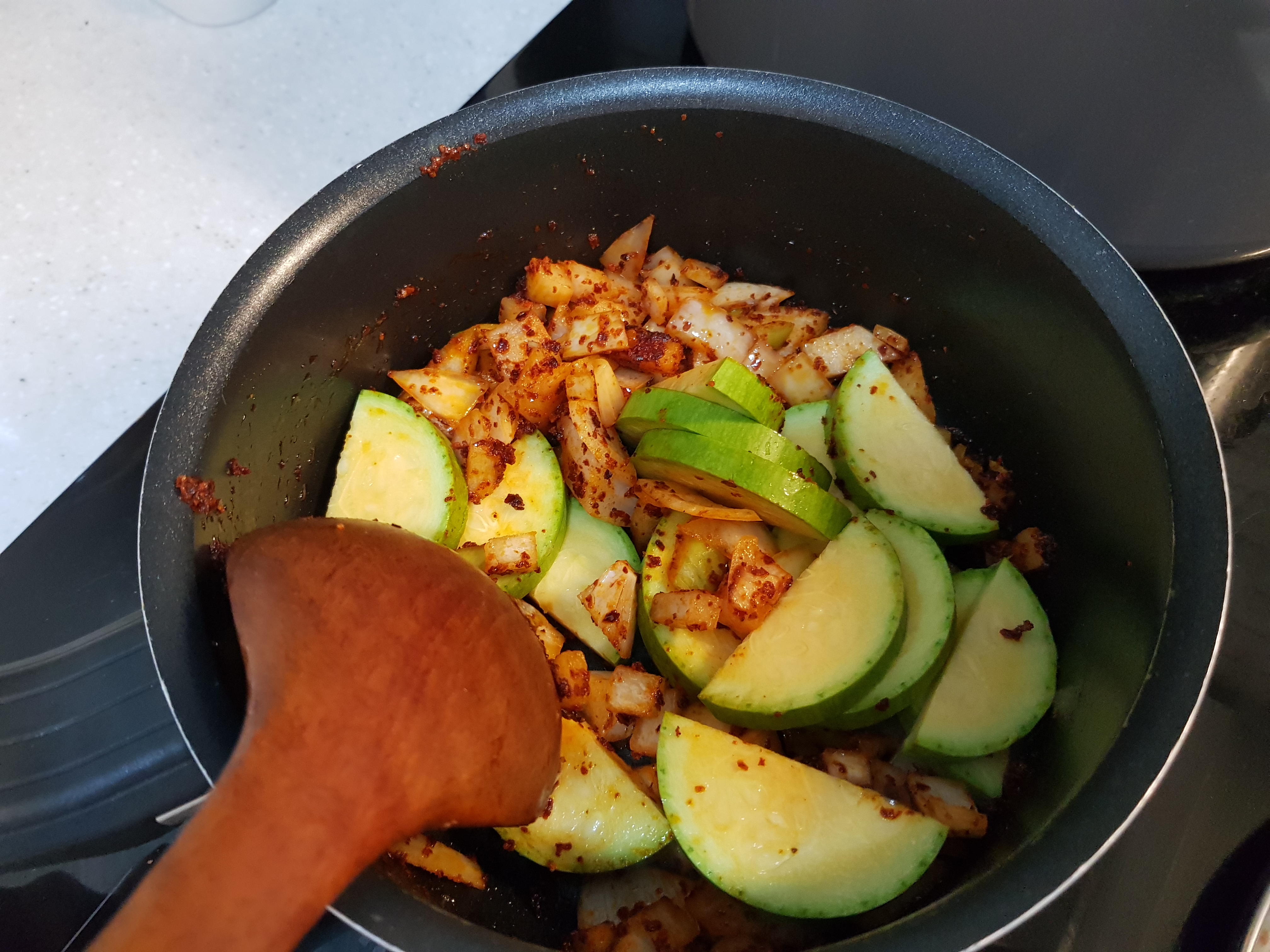 3. 그리고 애호박을 추가하여 볶아줍니다. (약불)
