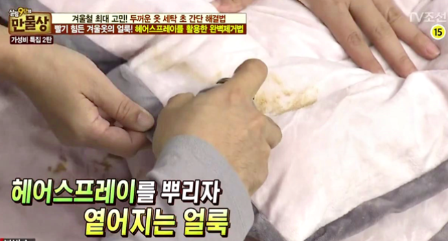 기름제거제 스프레이를 뿌려주거나 헤어스프레이로 얼룩이 있는 부분에 충분히 뿌려줍니다.