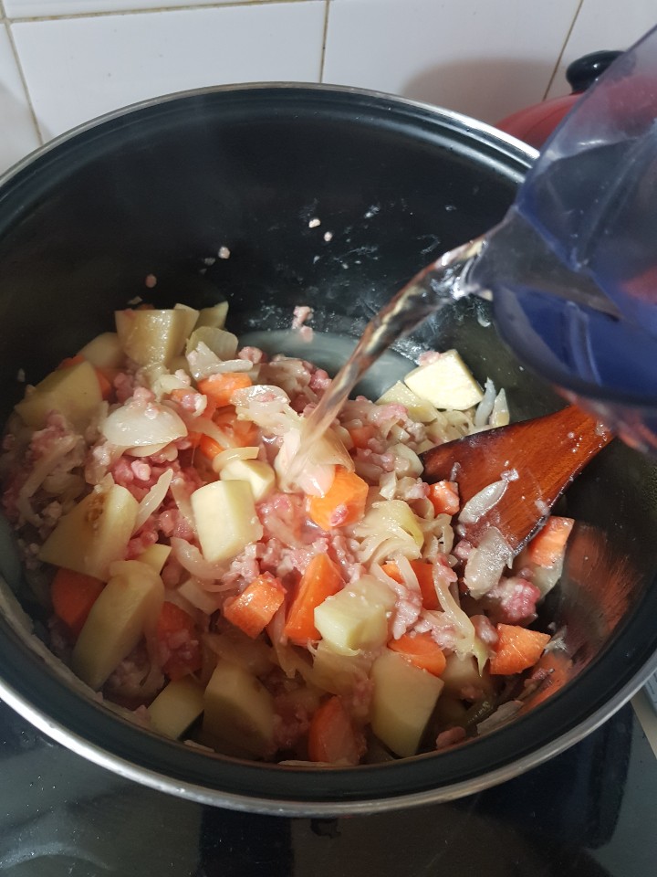양파를 볶아서 캐러멜 라이즈를 시키고 그 위에 당근, 감자, 돼지고기를 넣고 살짝 볶음!