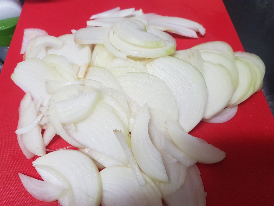 보이시나요? 하얀색의 양파가 노랗게 되었습니다.