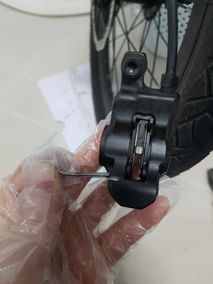 이제 브레이크에 끼워진 패드를 빼주기만 하면 됩니다.